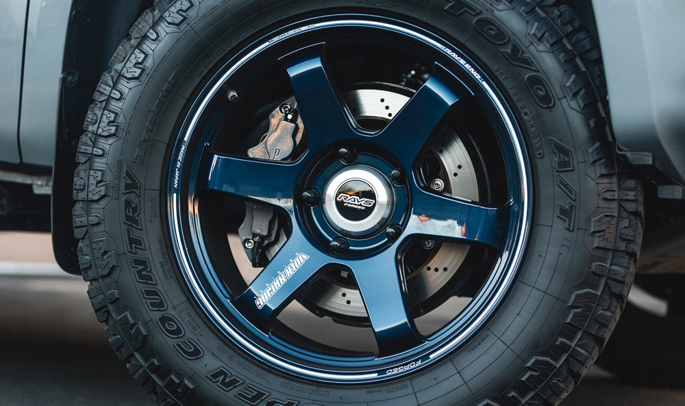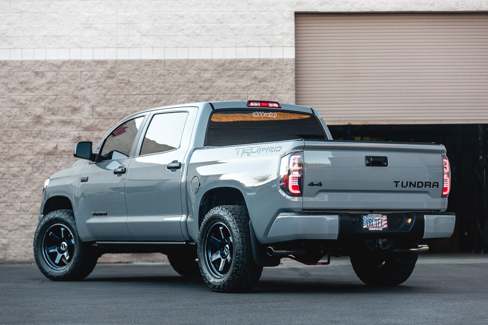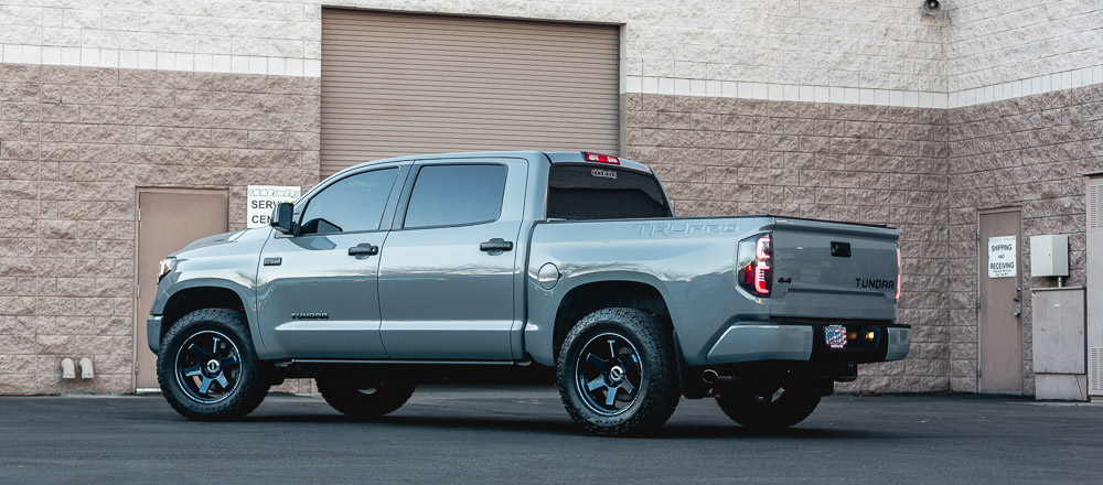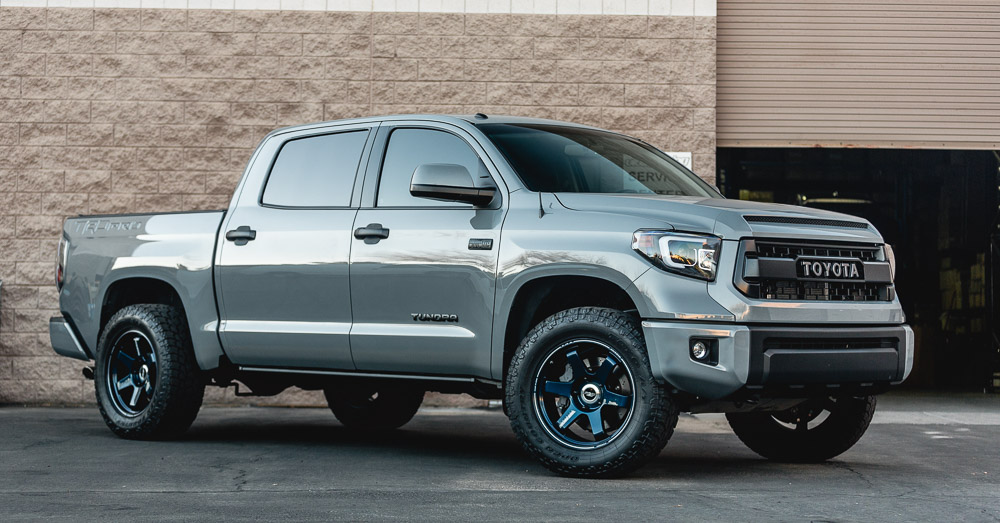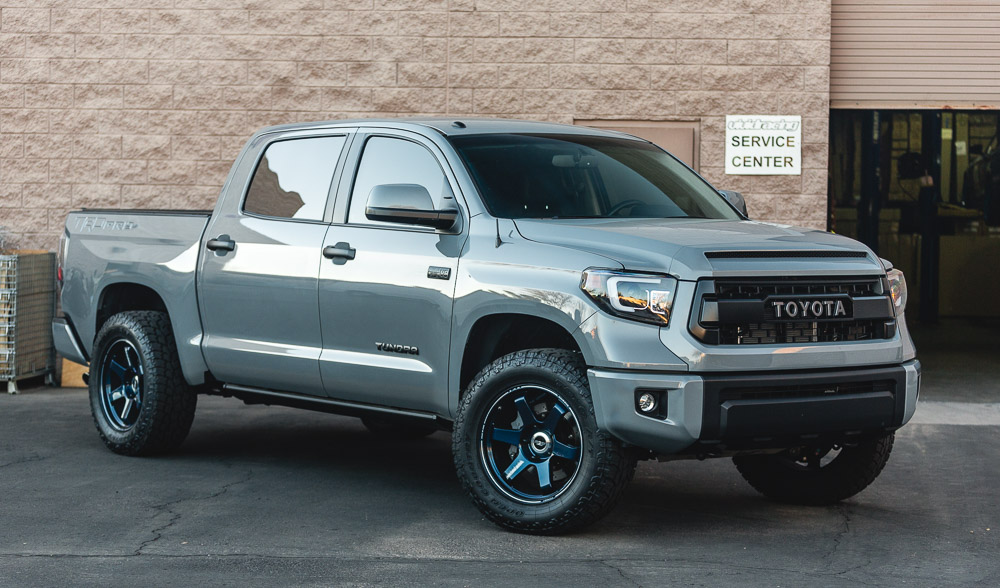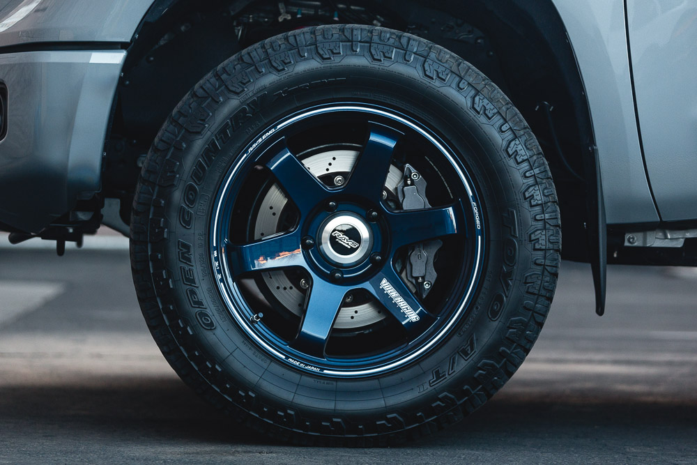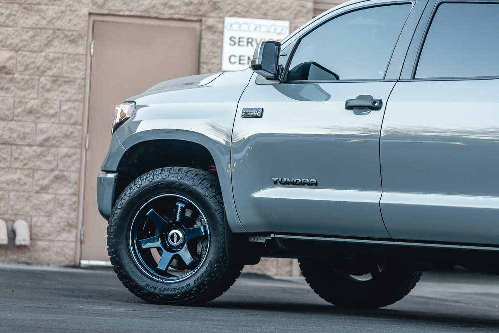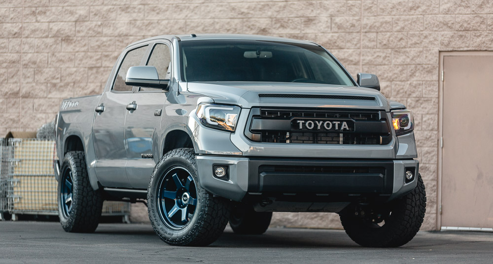 Is it possible to have any better color combo? Our Project Tundra is now equipped with these custom and one of a kind Mag Blue Volk Racing TE37 wheels. Why Volk Racing? Well, we already went into huge detail here about the weight savings and forged construction. These 20×9 wheels weigh only 25.5lbs which is much less than standard cast 18 or 20 inch wheels. This strength and performance comes at a price though! A common question we get is what lift is on the truck. This is just the factory TRD Pro suspension. Check out the photoshoot below!