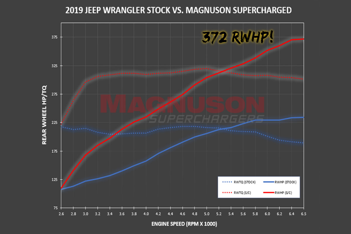 As tested by Magnuson, you can expect around 440hp and 380lb-ft of torque once the supercharger is installed. That’s a 59% increase in power compared to stock and 22% more power than a 5.7L Hemi! More importantly, the power gains can be felt throughout the entire rev-range thanks to the flat and wide torque curve.
