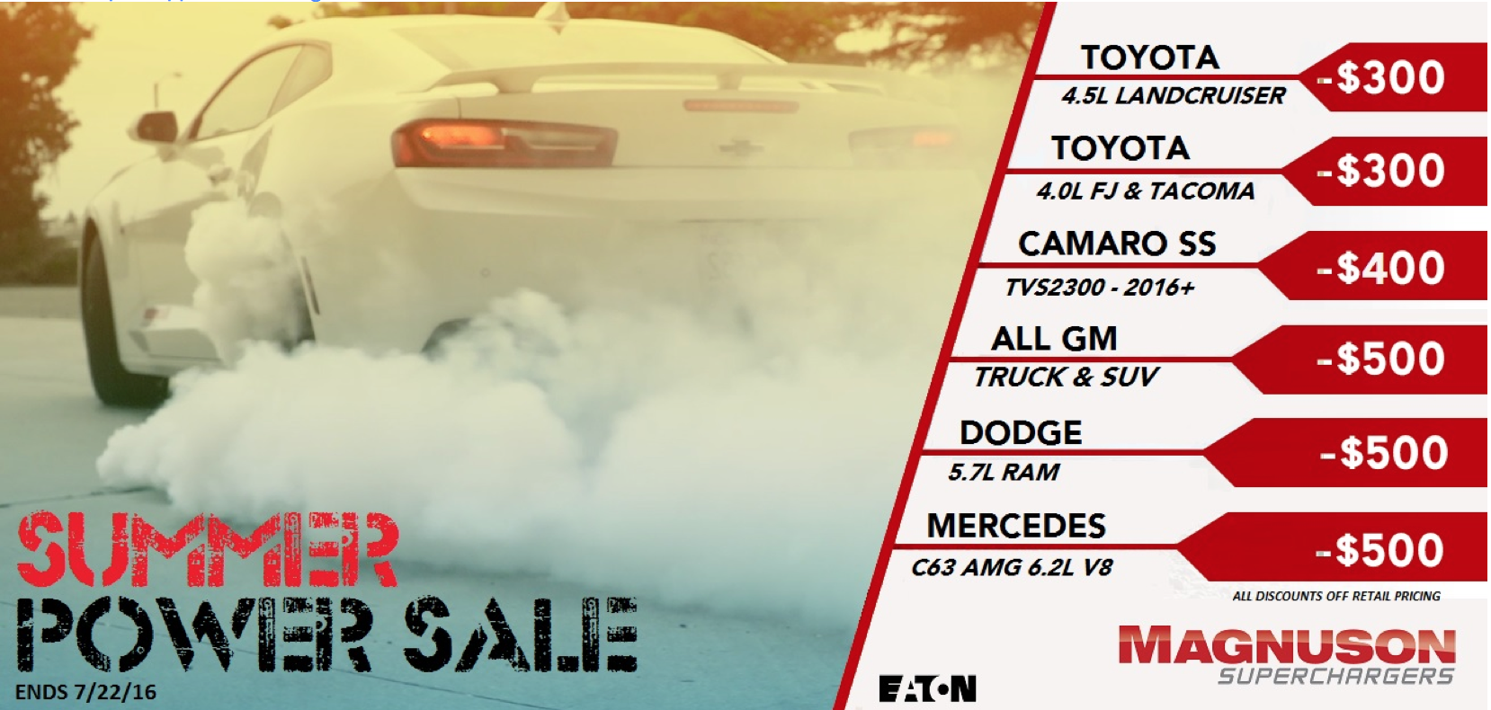 Magnuson is holding a huge summer power sale on superchargers until July 22, 2016. Make sure to get your orders in now and take advantage of this incredible offer. See the flyer below for more information regarding the products that apply with this promotion. You can view our entire lineup of Magnuson superchargers here.