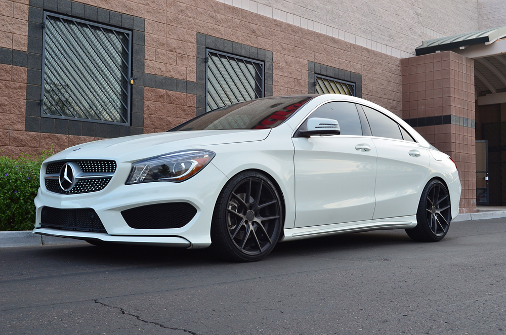 On our mini Project Car Mercedes CLA, we just showed off the complete H&R Spring installation. With the car now lowered 1.2 inches front and rear, it was time to get rid of those sucked in wheels and put some stance to make this car dance! The wheels are the Niche Targa 1 piece monoblock forged wheels. Niche wheels, house brand of manufacture MHT Wheels, has this awesome lineup of forged designs including the Targa. Very similar to the wheels we used on our 997.2 Turbo, its split spoke design is very popular, The front wheels are a 19×8.5 +42mm and the rear are a 19×9.5 +50mm. The wheels have been finished in a brushed double dark tint which gives it a different look depending on the light and angle. Needing more rubber, the wheels were wrapped with 235/35/19 and 265/30/19 tires.