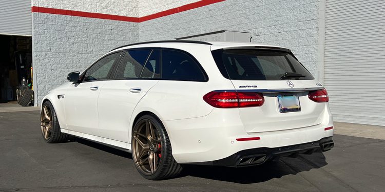 The wheels that upgraded the look of the Mercedes E63 AMG Wagon in these photos are available in various finishes including Satin Bronze which is pictured below. The wheel diameter available is 21 inches, and the wheels can be custom-made to the customer’s requests including color, offset, and bolt pattern but in these photos, the front wheels are 21×10 +13, the tire size is Michelin Pilot Sport 4 S 275/30ZR21/XL, while the rear wheels are 21×11 +50, and the tire size is Michelin Pilot Sport 4 S 305/25ZR21/XL.