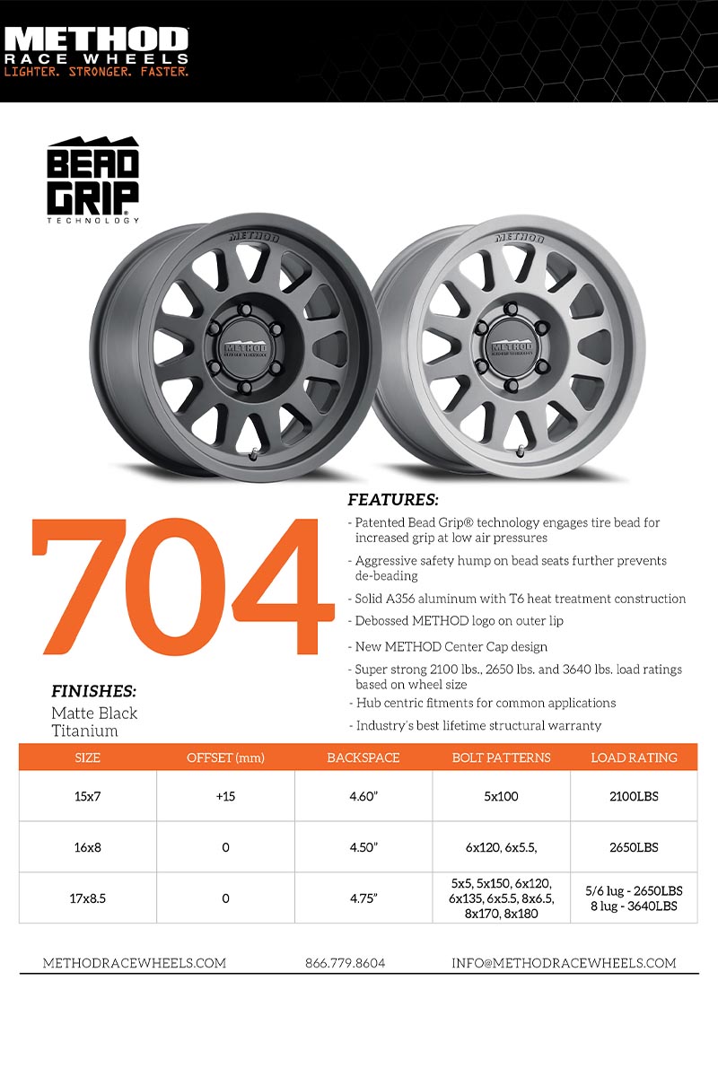The new 704 wheel has the patent-pending bead grip design from Method Race Wheels. This new technology allows the driver to run lower psi in the tire without risking the tire de-beading. Lowering the tire pressure gives the driver more grip in specific off-roading applications putting weight on the sidewall. With the all-new bead grip integrated into the wheel, the driver can have higher confidence in their tires having a vice grip on the bead of the wheel.