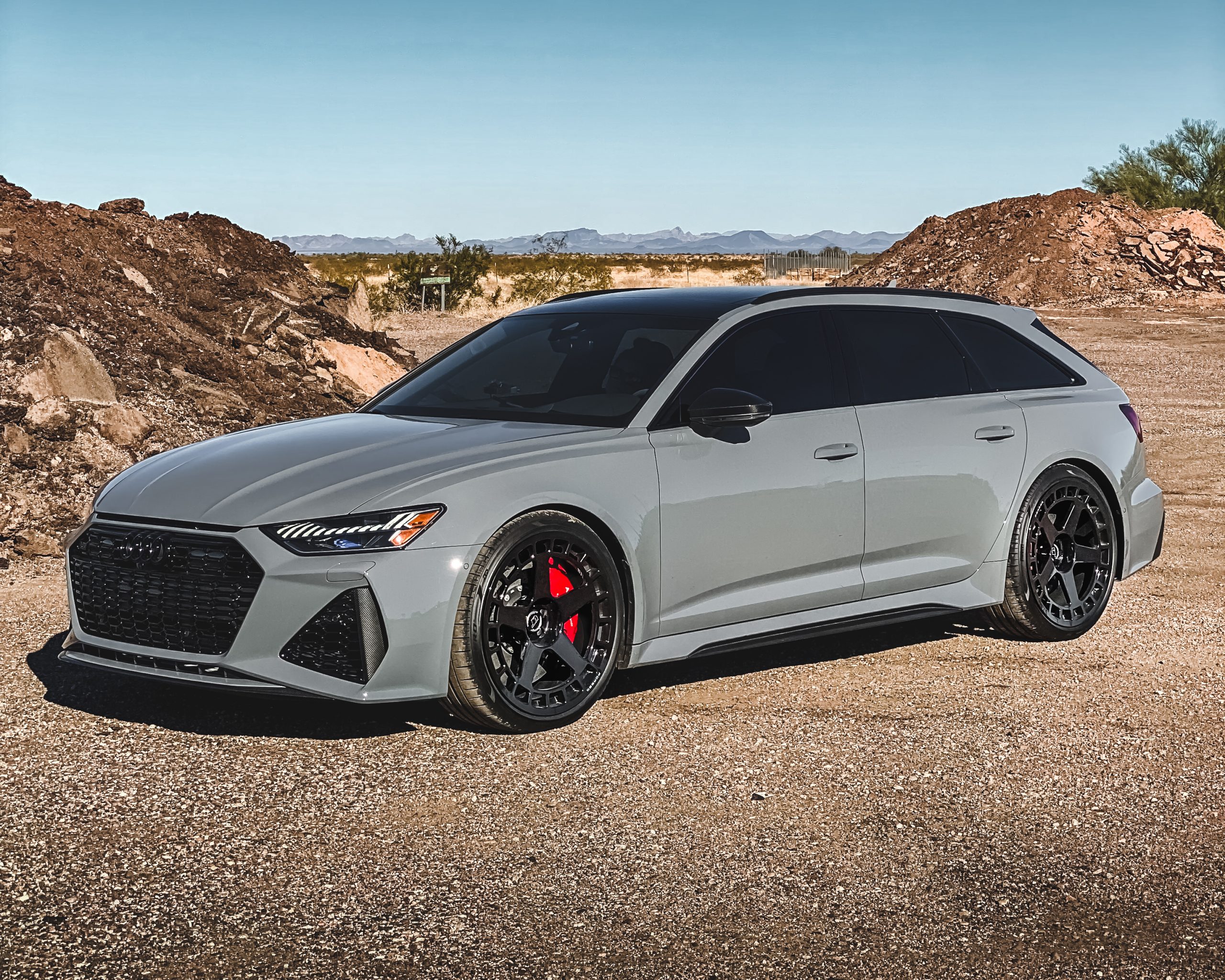 The Audi RS6 featured in the gallery below is wearing the VR Forged D12-R wheels in a lustrous gloss black finish. They measure 22×10.5 all around with a +12mm offset, 5×112 bolt pattern, and 66.5 center bore. The D12-Rs are seamlessly wrapped in 285/30/22 OEM tires for a precise fit. With the Nardo Grey exterior, these wheels are a perfect match to Audi’s flat but ultra-glossy grey paint. It’s no wonder why Nardo Grey is such a favored color. It just looks incredible no matter where or in what lighting; and with the VR Forged rally-inspired D12-Rs, this Audi RS6 Avant is ready to steal the limelight.