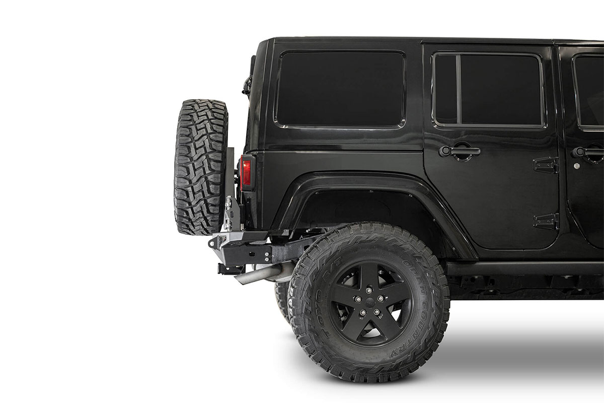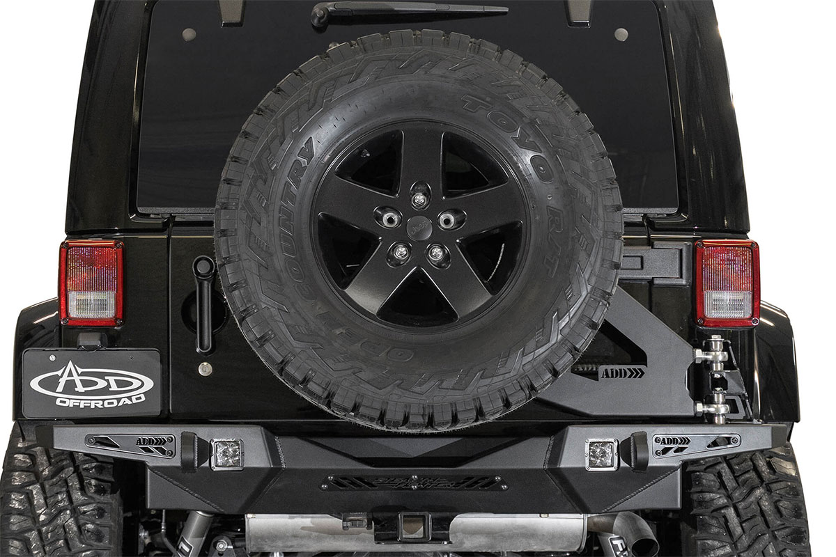 The rear tire carrier is a separate piece which is designed the work with the ADD Stealth Fighter rear bumper. Using two spherical bearing mounts and a strong steel design, the tire carrier allows for mounting of 40” tire. The tire mounts swings open with the OEM tailgate.