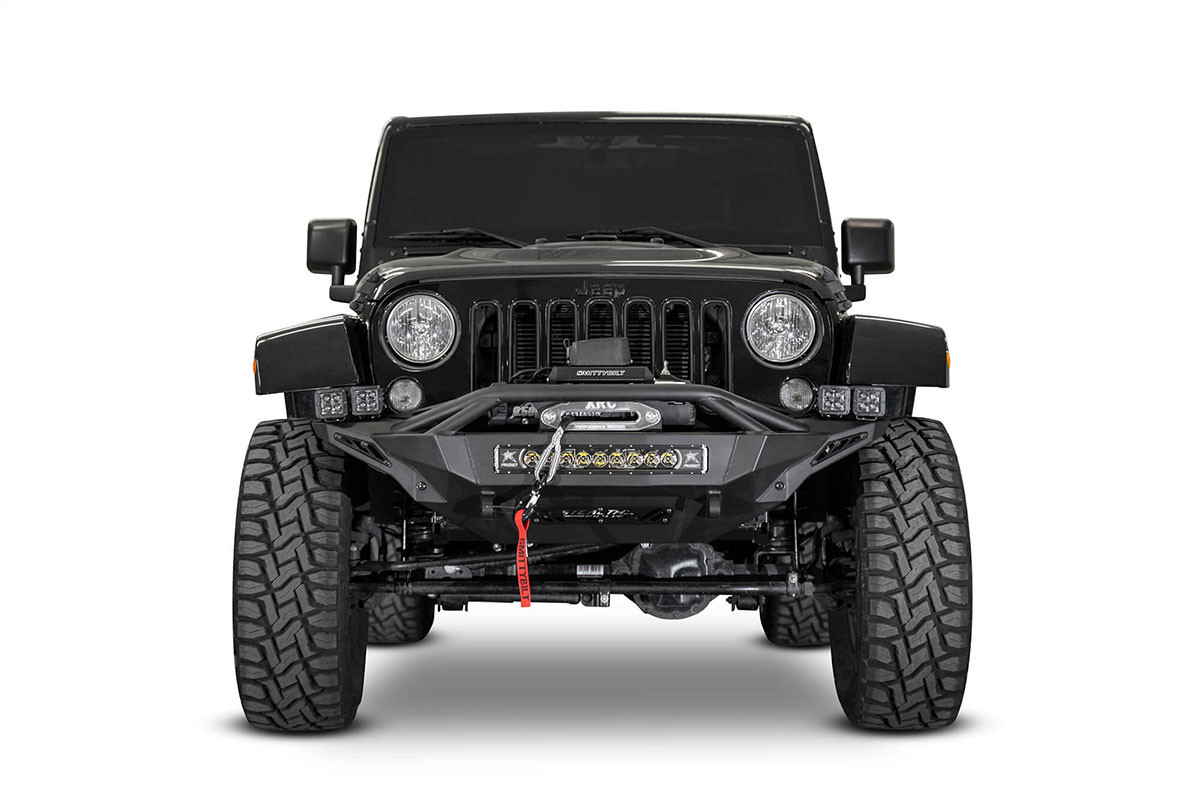 The front bumper offers a few different options. The base bumper features a large center cutout with mounting tabs for a 20” LED light bar or five LED light cubes. The top corners feature mounts for 2x LED light cubes per side. A top hoop and winch mount are optional add ons for those who need extra functionality.