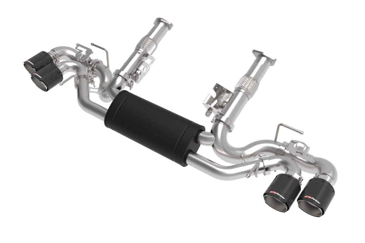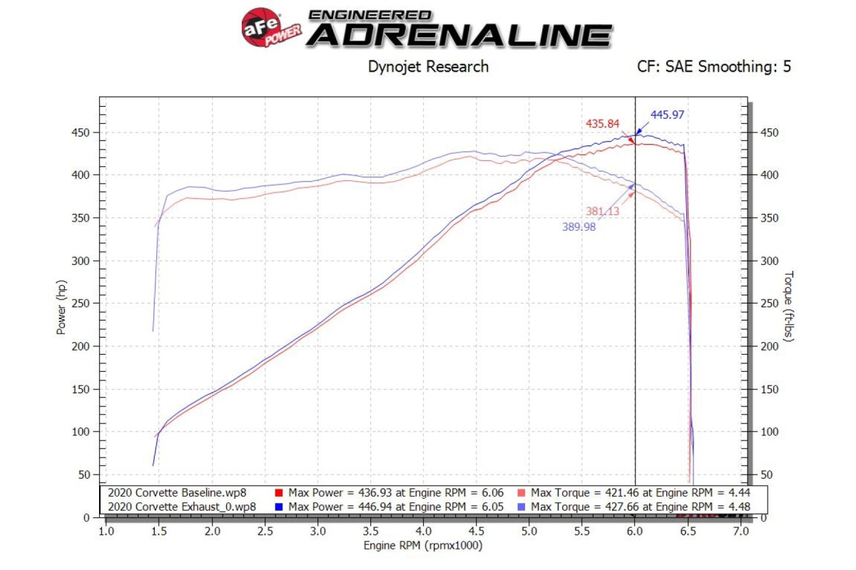 aFe’s performance exhaust system with NPP valves is for vehicles with the performance exhaust package while retaining factory AFM (Active fuel management) valve functions. The valves help regulate, direct, and control the flow of exhaust gases by opening, closing, and partially obstructing passageways (depending on throttle position) for optimal performance benefit. This direct bolt-on system is available with three styles of quad 4.5-inch tips in Carbon Fiber, Polished Stainless, or Ceramic Coated Black. No cutting or modifications are needed, making installation simple and straightforward. According to aFe’s in-house dyno, the MACH Force-Xp Exhaust for the C8 adds up to 9 horsepower and 10 pound-feet of torque, with no tuning necessary.