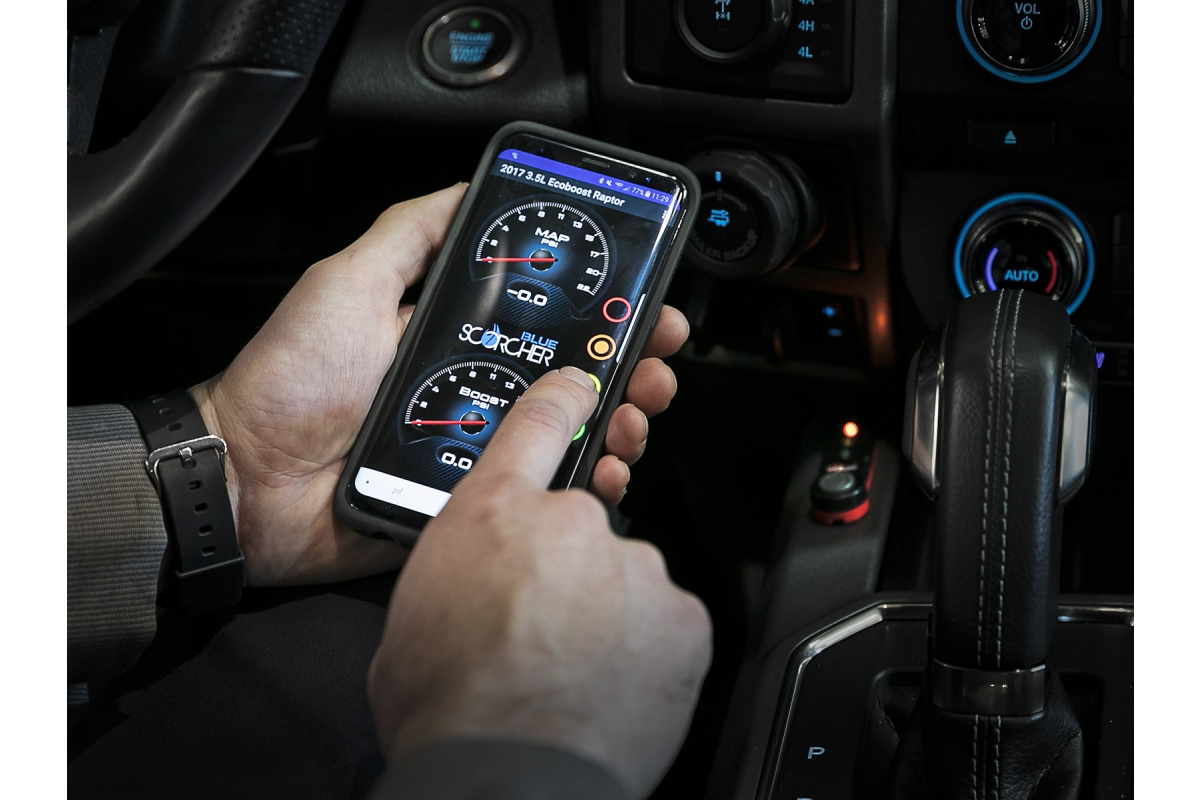 The SCORCHER BLUE Power Module features an LED control switch for in-cabin, on-the-fly power adjustments with different preset modes. With Bluetooth 4.0 connectivity, you can tap into your iOS or Android device to make power adjustments, custom tune different power modes, view gauges for engine parameters, upgrade to the latest revision, measure acceleration times, and more! The app is available to download for free on the App Store or Google Play store. This ultimately allows your smartphone device to become a handheld remote for the module.