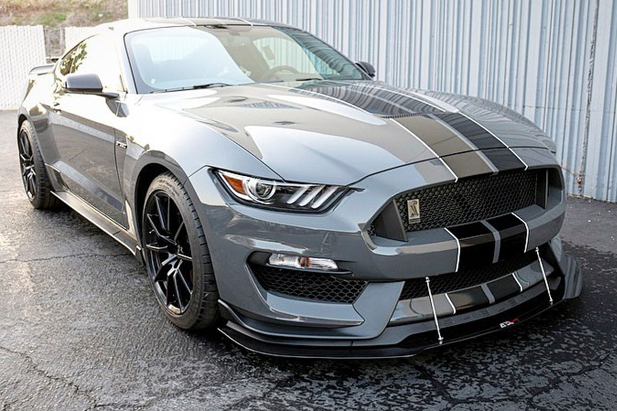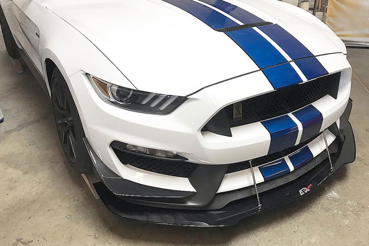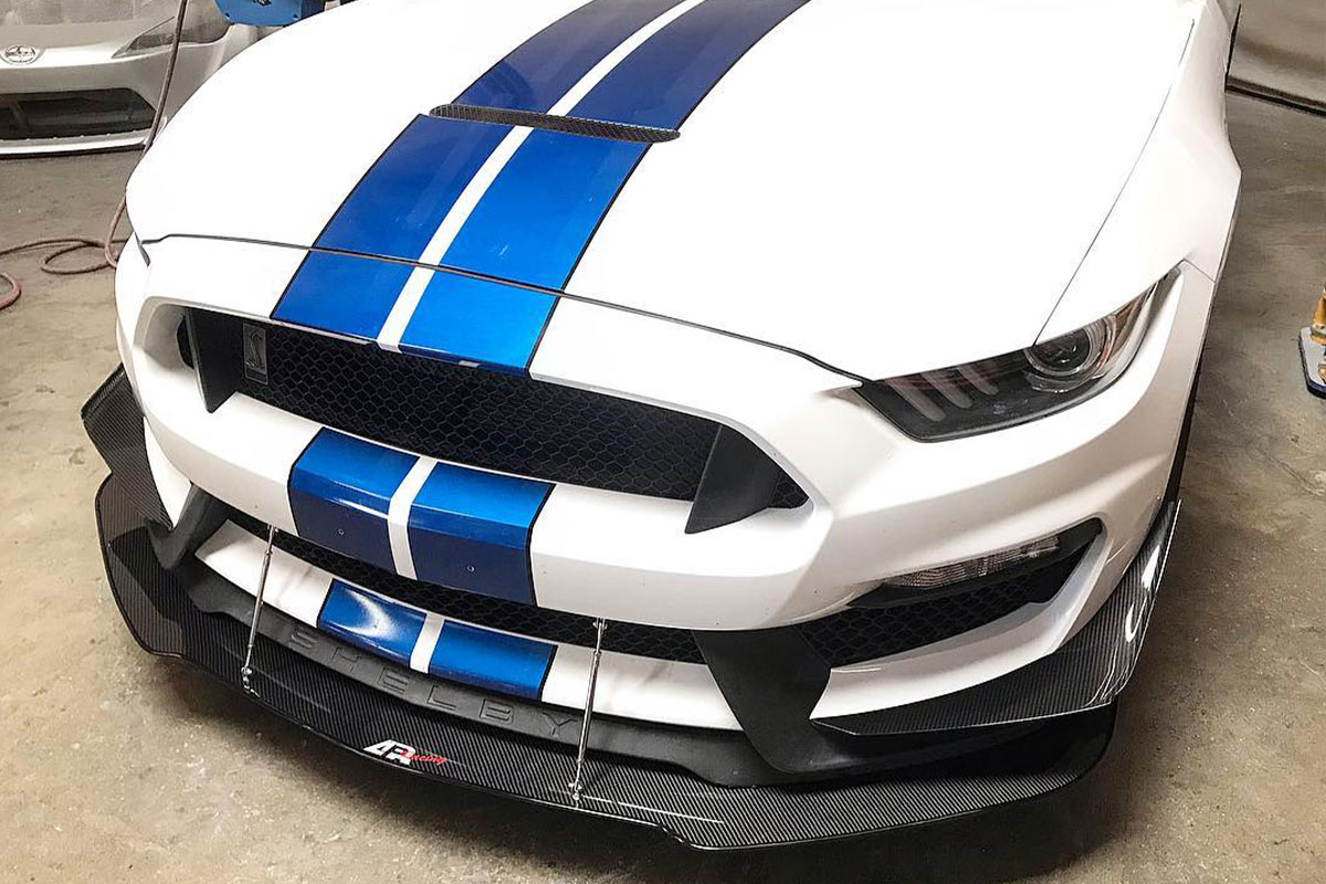 They are offering a splitter for the non-performance pack Mustang, performance pack Mustang, as well as the GT350. Both splitters are designed to counteract front-end lift and increasing front-end grip. The splitter is carbon-fiber reinforced and features support rods to help keep it in place.