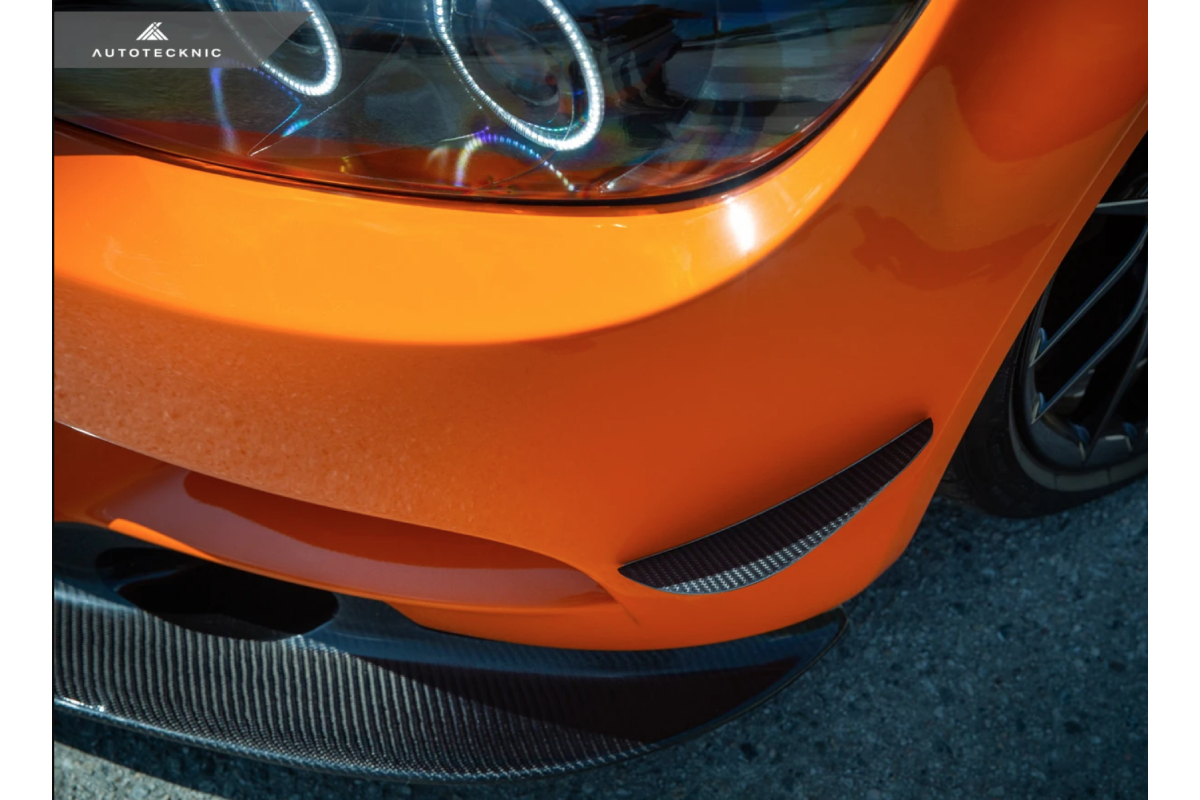 The new AutoTecknic Carbon Fiber Front Bumper Canards for the BMW M3 are the complete solution to aerodynamically tune the vehicle’s front end handling while remaining aesthetically pleasing. Crafted from lightweight and durable carbon graphite composites, AutoTecknic’s Carbon Fiber Canards help increase front downforce at high speeds, thereby stabilizing the M3’s chassis during hard cornering. This simultaneously increases traction, as well, for faster lap times. As aforementioned, the characteristics of carbon fiber also add more aggressive styling to the front of the BMW E90 M3, E92 M3, and the E93 M3.