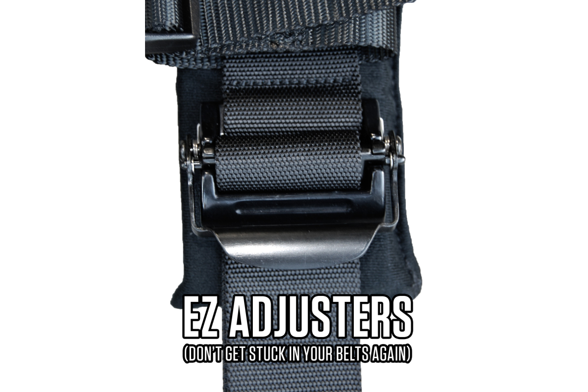 - EZ adjusters on lap and shoulders – allow you to adjust your belts quickly, even if they are dirty or muddy