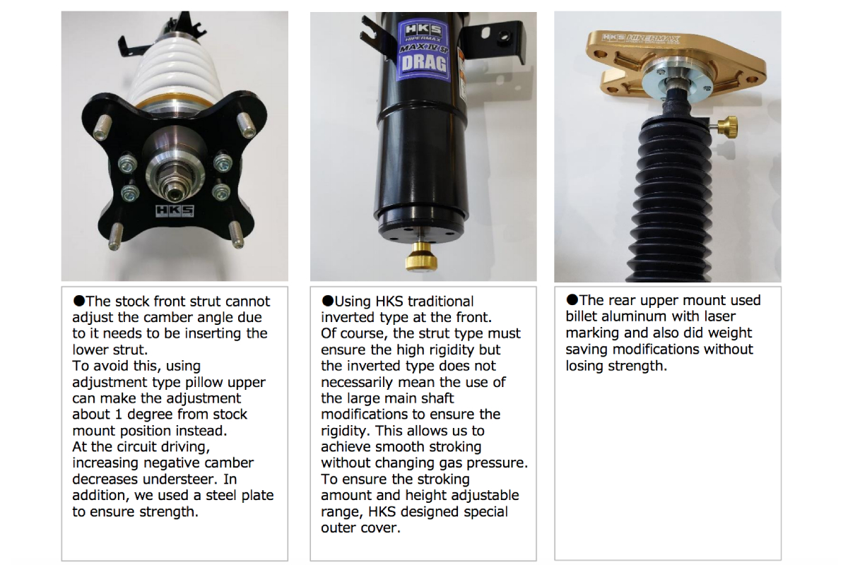 In HKS’ internal test, the brand’s factory shock length settings can perform shorter drag time. What’s more, it will have more a competitive edge after adjusting the shock length of vehicle posture properly for the unique vehicle (i.e. the Supra here) and track. HKS also used launch controls to test for time differences. As a result, it was confirmed that a time of 0-100 km has an advantage of about one second. It was also found that the loss was suppressed by the traction applied to the rear tire in the zone inducing a wheel spin.