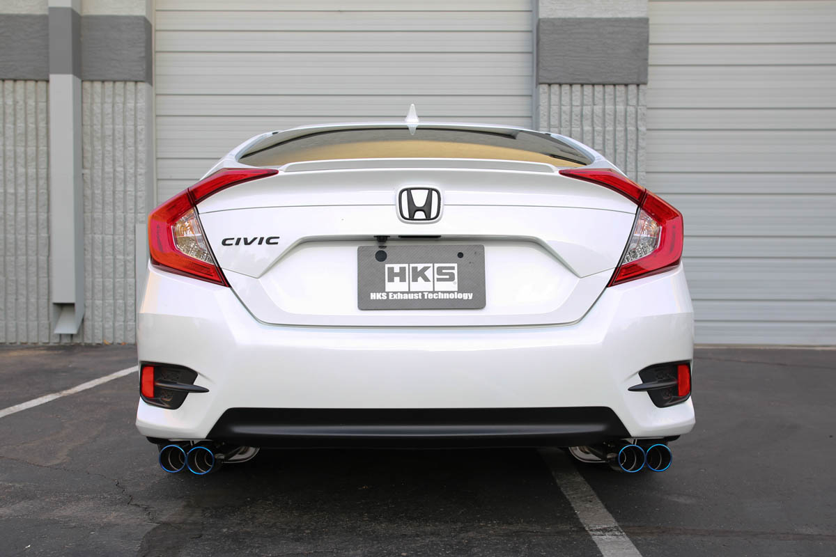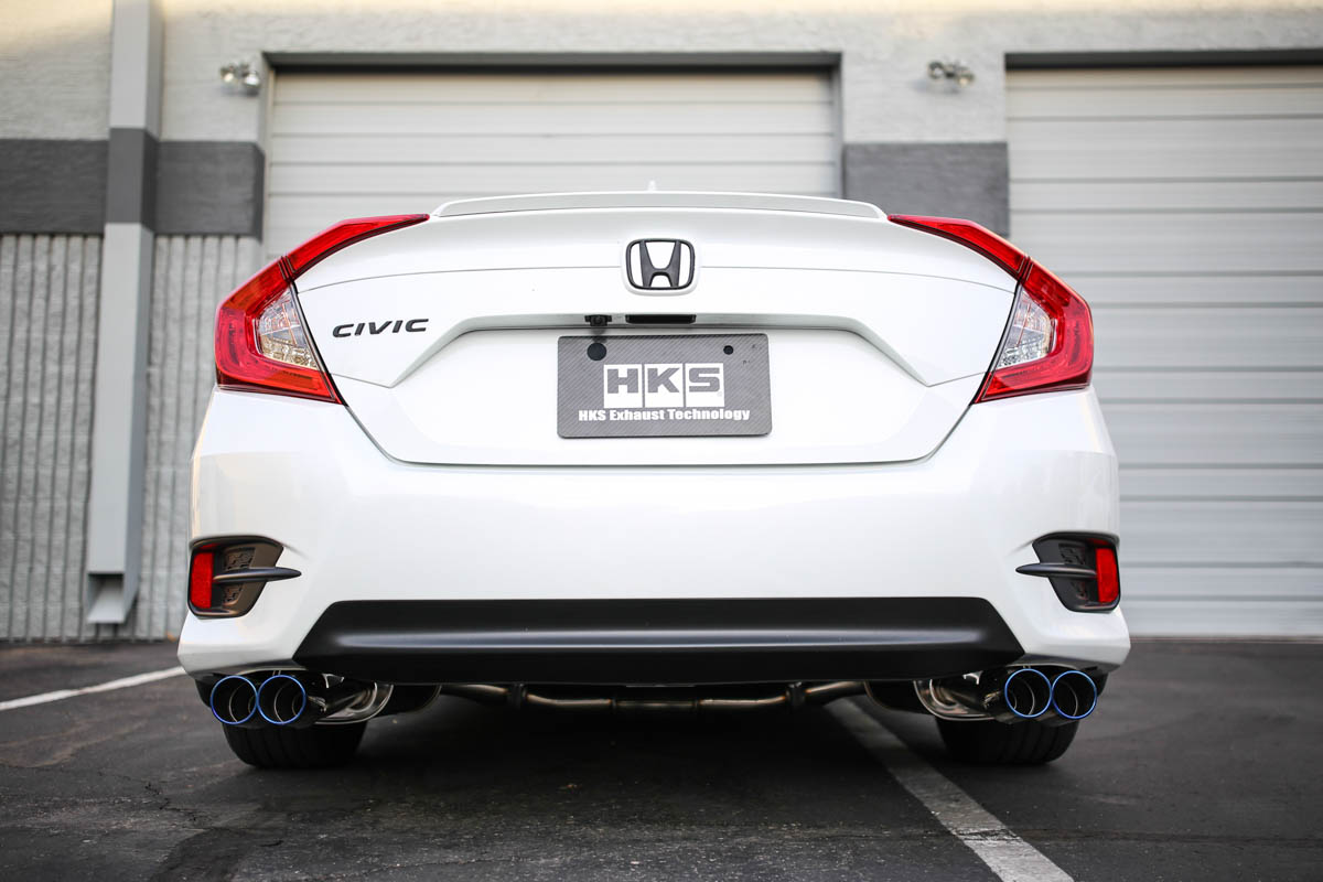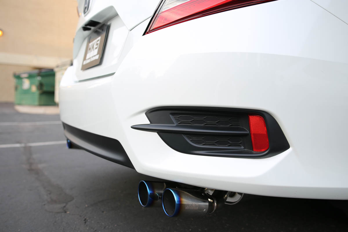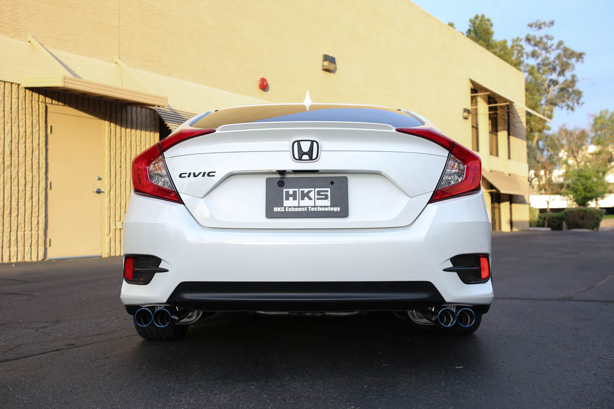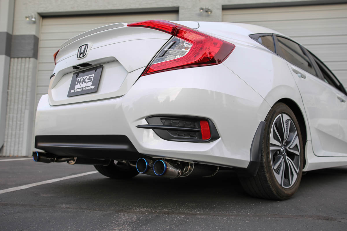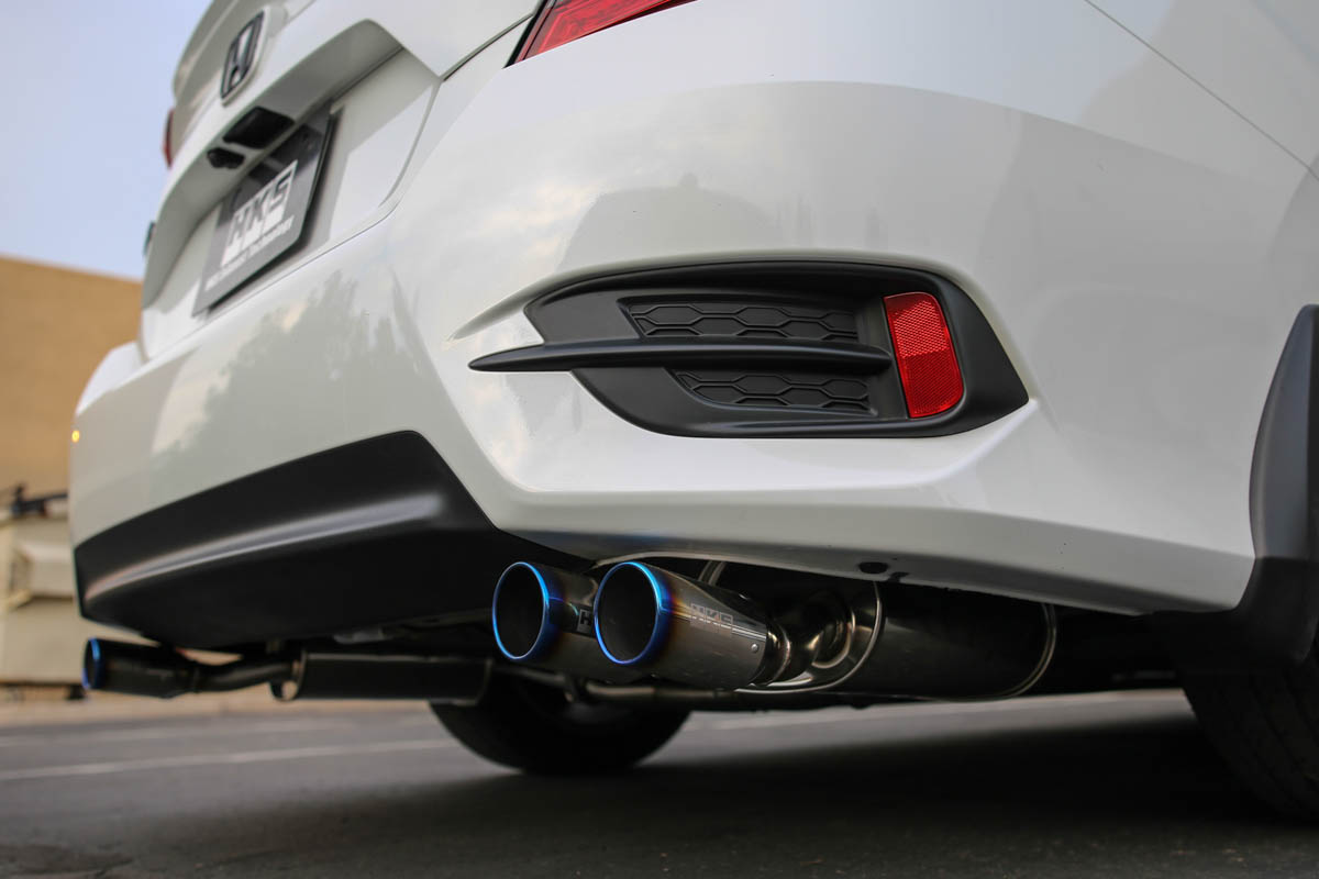 One of the big problems with the low model Civic Sedans is the lack of visible exhaust tips. The SI has one large center exhaust tip, and the Type R has a triple tip center exhaust setup, but the low models have no visible tips. HKS fixed this by implementing a quad tip design on the new Legamax exhaust. On top of having four visible tips, the tips have a burnt titanium look, giving your Civic a unique and awesome look.