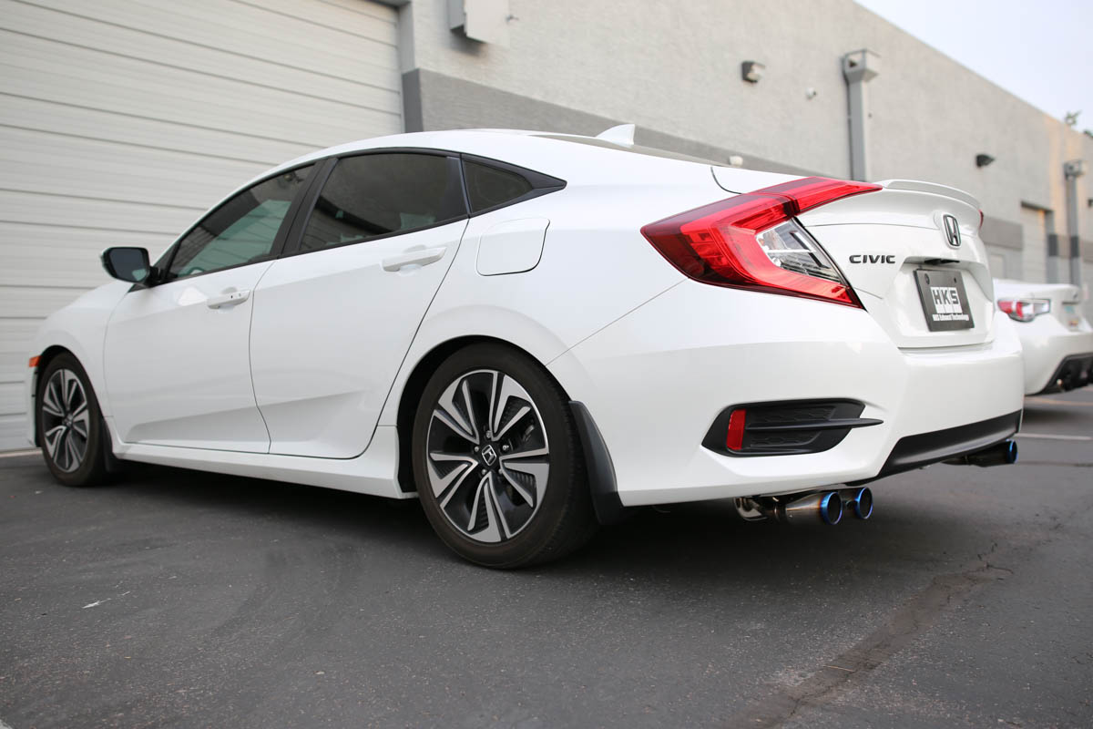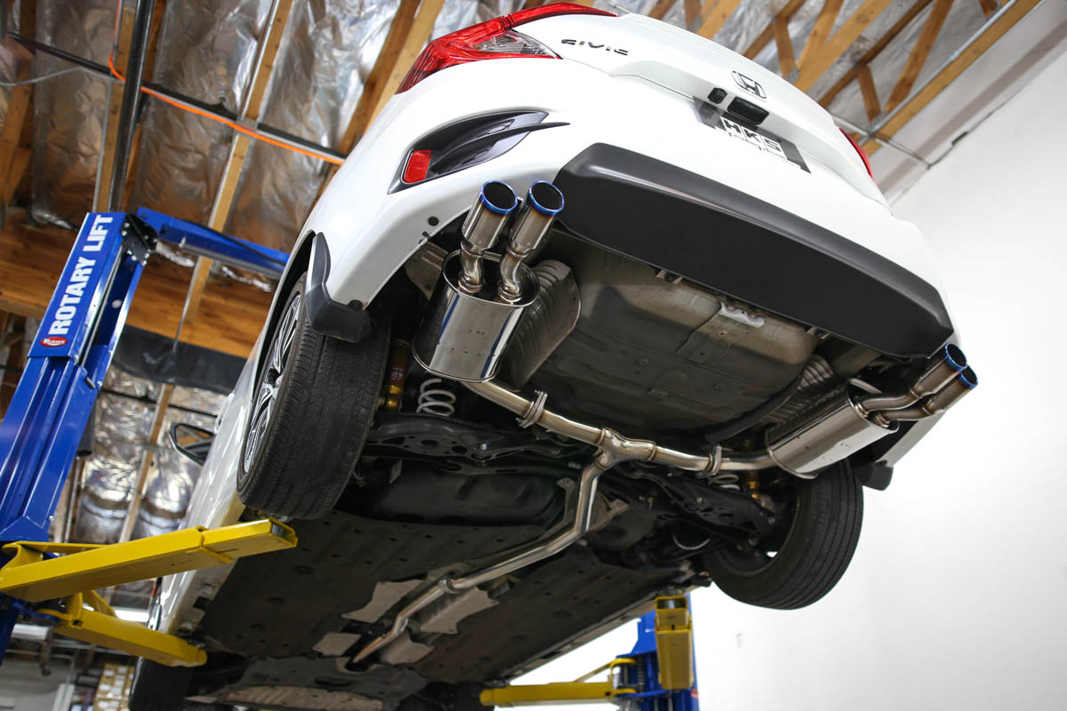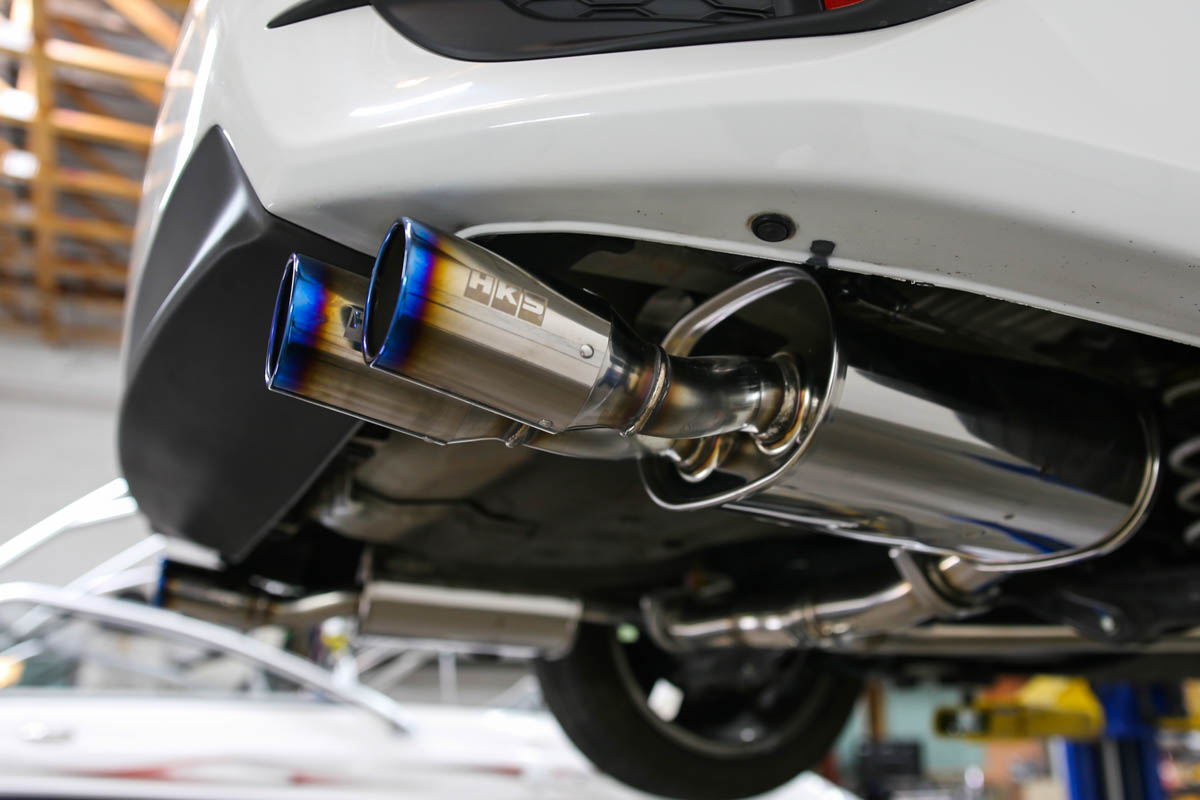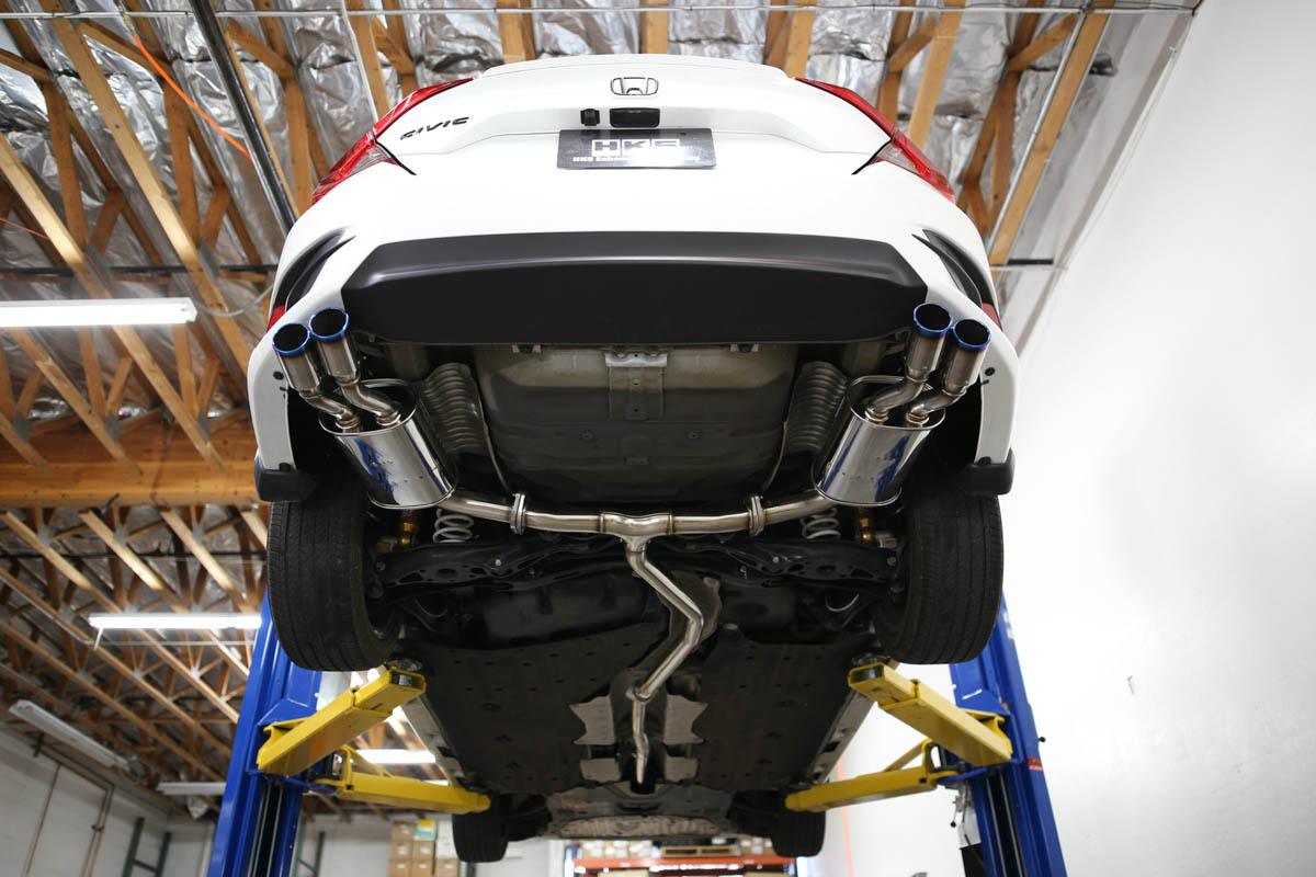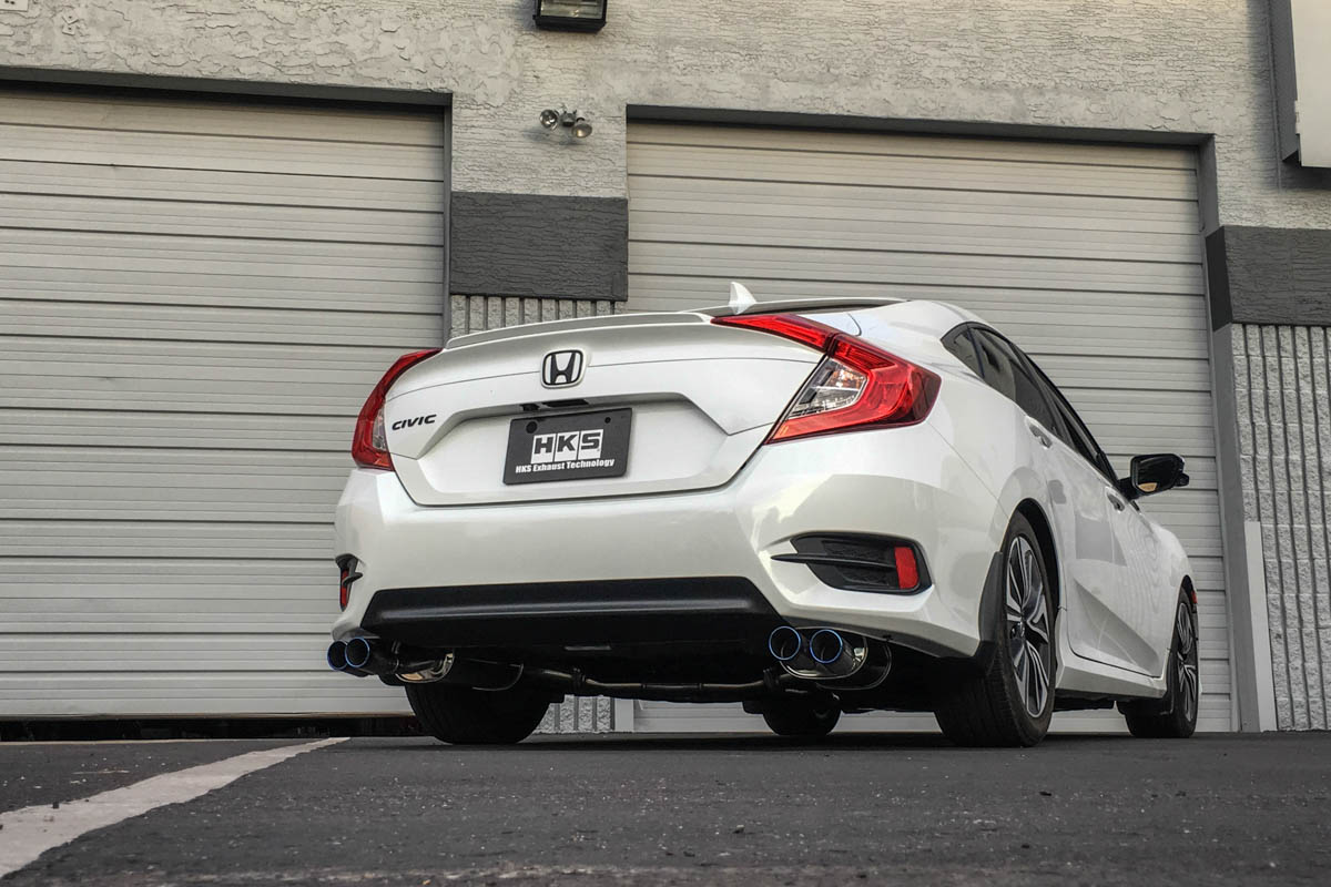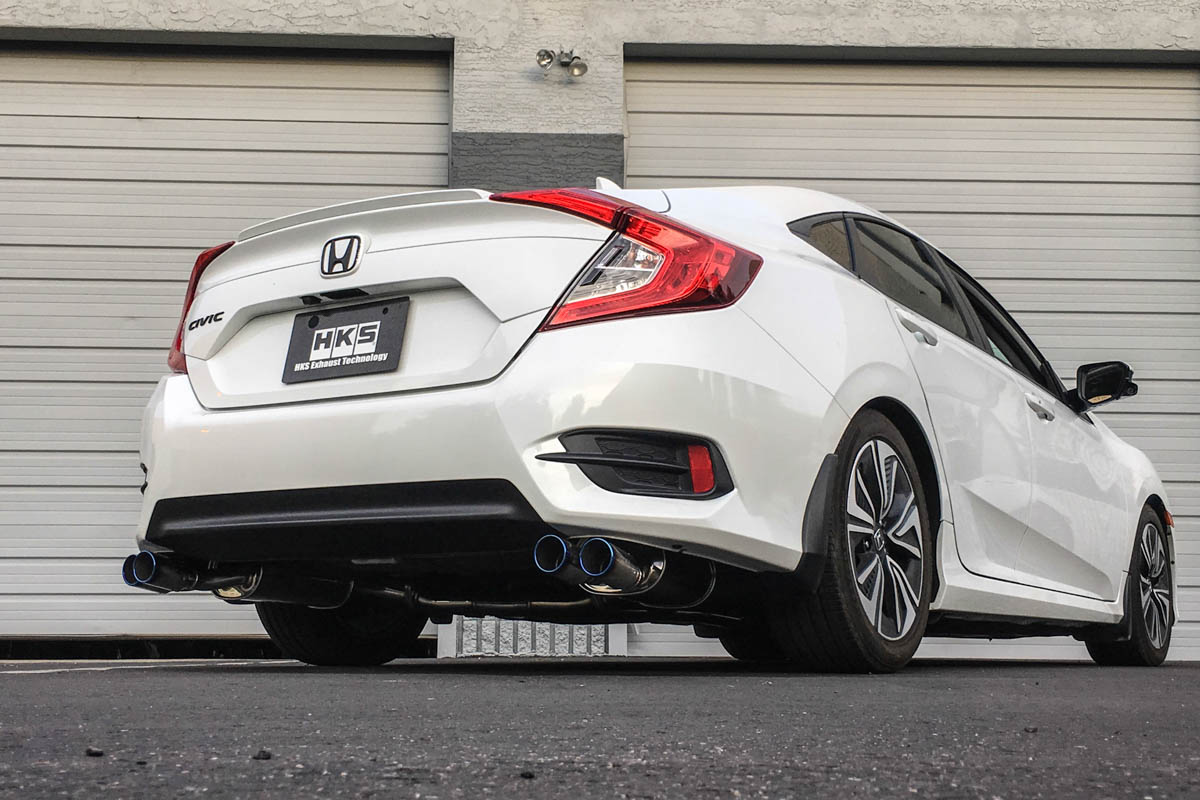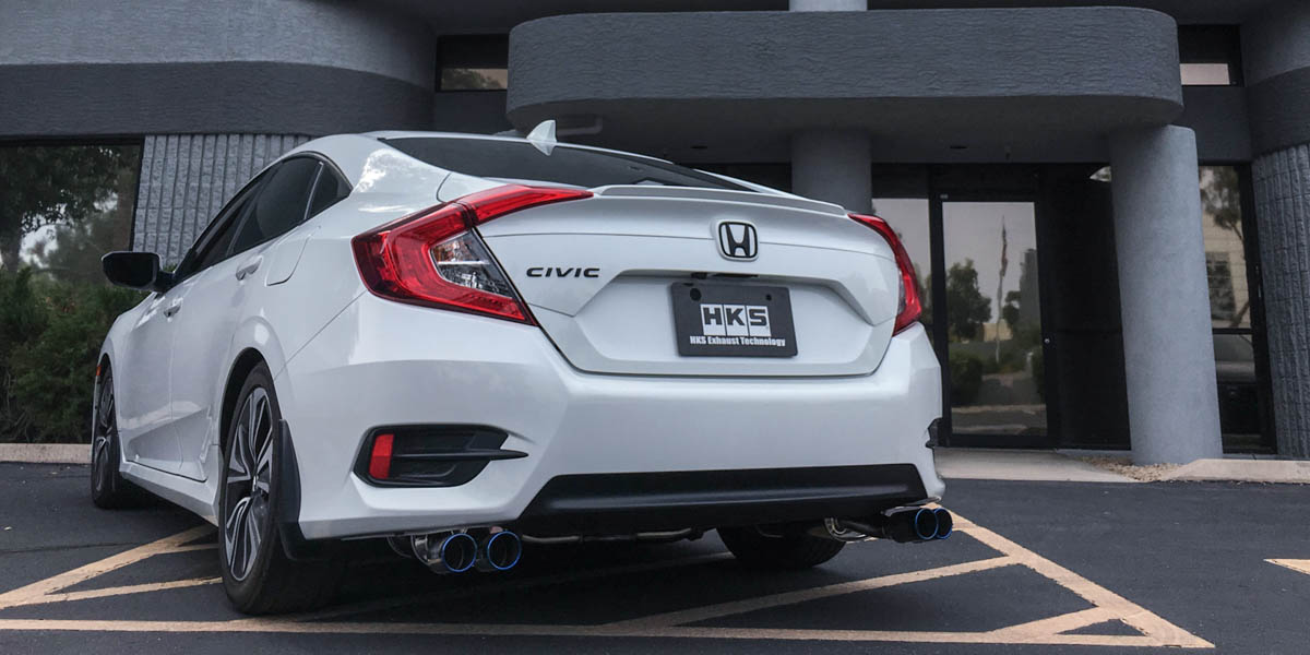 One of the big problems with the low model Civic Sedans is the lack of visible exhaust tips. The SI has one large center exhaust tip, and the Type R has a triple tip center exhaust setup, but the low models have no visible tips. HKS fixed this by implementing a quad tip design on the new Legamax exhaust. On top of having four visible tips, the tips have a burnt titanium look, giving your Civic a unique and awesome look.