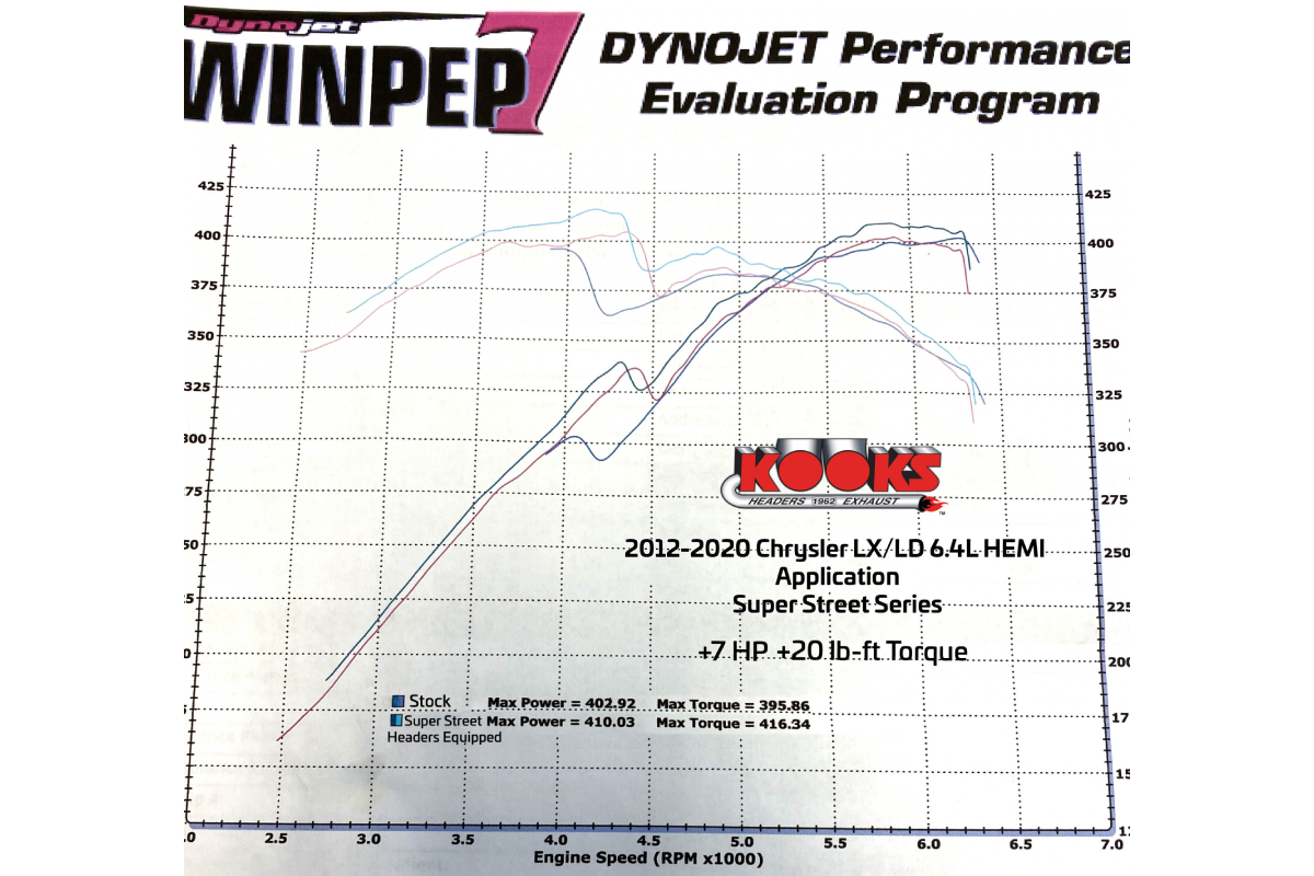 With the Kooks Super Street Series headers bolted onto the 6.4L Hemi engine, the dyno test results produced gains in both horsepower and torque without any tuning. The dyno graph showed an increase of 7 horsepower and 20 pound-feet of torque over the stock manifolds when measured at the tire. It’s important to note, however, that performance gains may vary depending on tuning and other performance modifications.