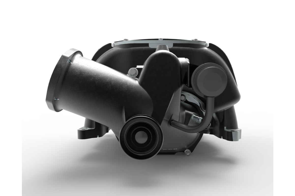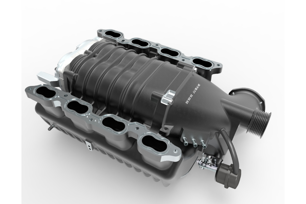 The single cast unit and appropriately sized rotating group eliminate potential leak points and allow for a slim and compact design that won’t sacrifice key airflow characteristics. The unit features a high-velocity flow path through the supercharger rotors and an unrestricted discharge port into the plenum. The large plenum equalizes flow across all ports as air feeds evenly through the low-pressure-drop, dual internal air-to-water charge air coolers. Finally, the ports are separated into individual runners, resulting in a greater operation by eliminating any cross-fire.