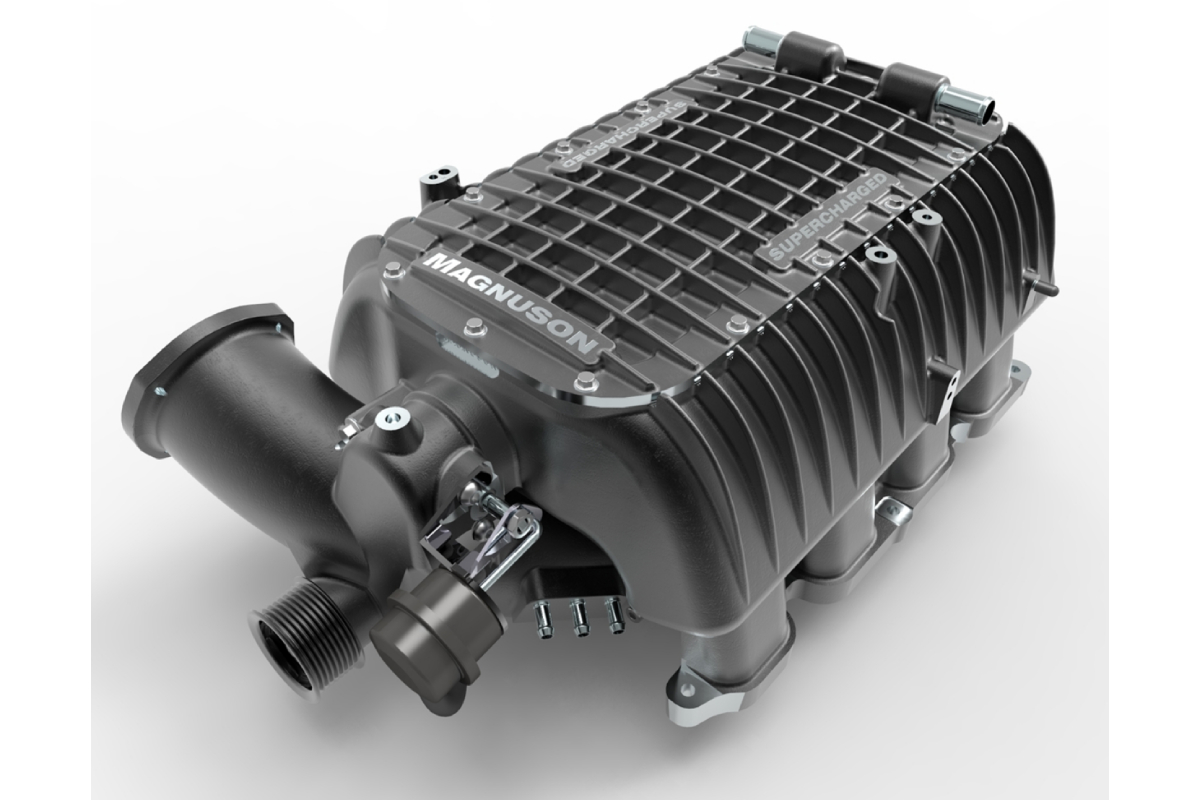 The OEM look of Magnuson’s integral supercharger system on this platform allows advancements like a single large charger air cooler, a larger plenum, and tapered runners. At the heart of this system is Eaton’s latest Twin Vortices Series (TVS) supercharger unit, the TVS1900. The supercharger system is a positive displacement, roots-style pump, utilizing Eaton’s lightweight, four-lobe OEM-proven rotors. The complete unit is quiet, compact, attractive, simple to install, and requires little to no extra maintenance. What’s more, it boasts a factory-like fitment and finish that will improve the overall appearance of your underhood compartment.