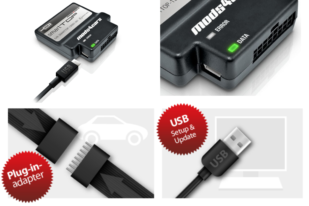 For a quick and seamless installation process, the convertible top module comes with a specially developed plug-and-play adapter. The connection between your car’s electronics and the SmartTOP module is established by simply plugging them together. Moreover, a standard USB is integrated into the module to enable configuration on the home PC and the installation of software updates. These updates are provided by Mods4cars to its customers completely free of charge.