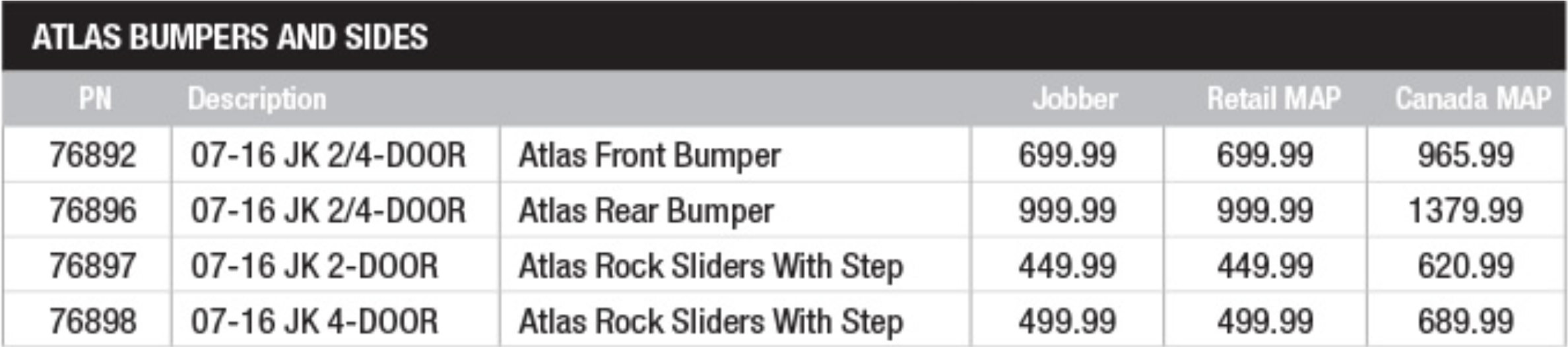 The XRC Atlas front bumper’s innovative 4-piece design features a lowered winch plate that allows for a greater airflow. The rear bumper utilizes a new cam-style pin adjustment to ensure nothing less than perfect gate stowing each and every time. Smittybilt’s matching rock sliders (also known as rock sides) feature anti-slip step pads for easier access and are now available to consumers to complete the entire set!