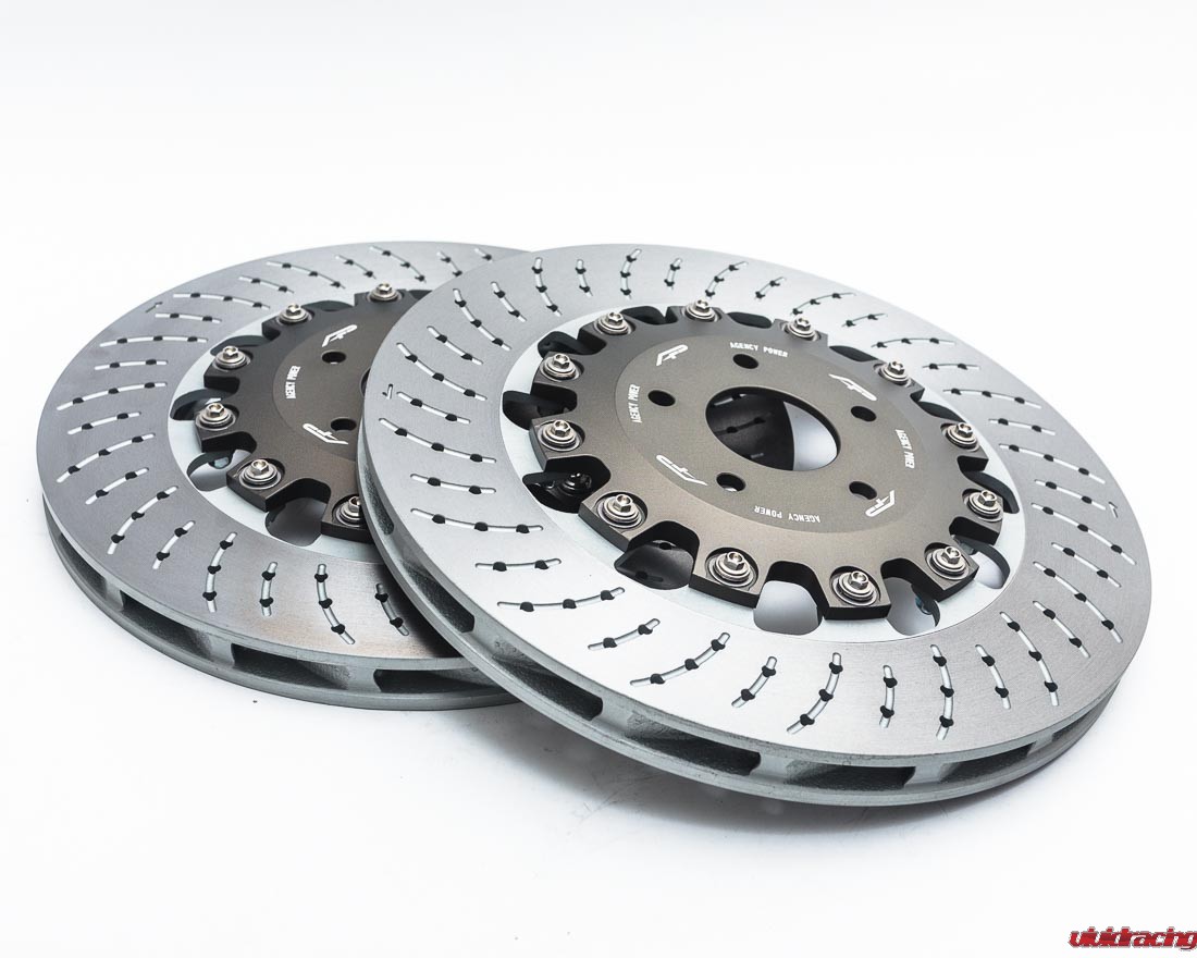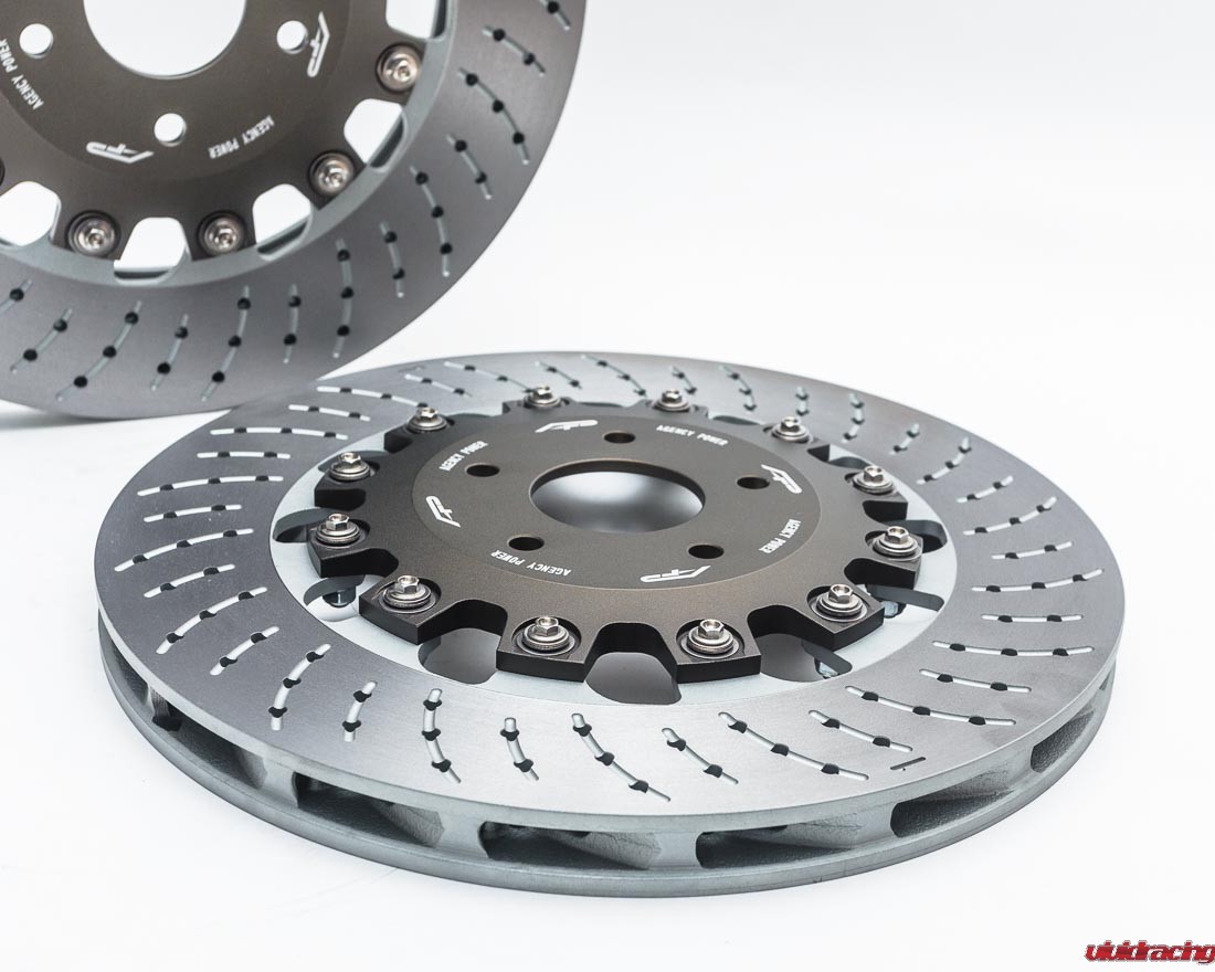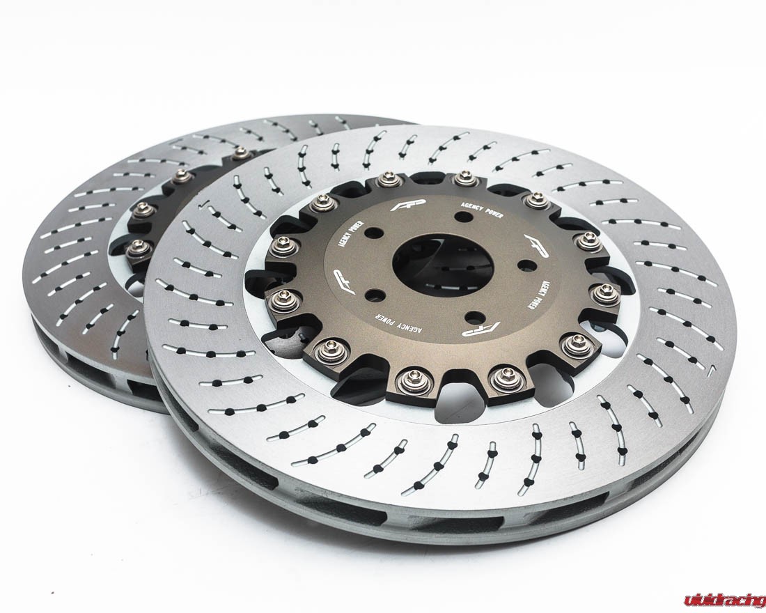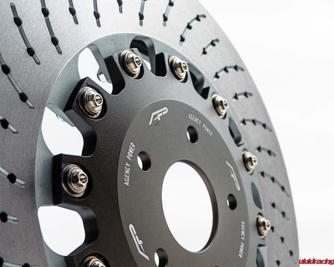 Looking to get better stopping power on your Nissan GT-R? Agency Power makes this happen with a new front and rear upgraded brake rotor kit for all 2008-2017 Nissan GT-R’s! The Nissan GT-R is fully equipped from the factory with a set of Brembo brakes to give it a stopping distance of 94 feet comparable to cars like the Porsche 918 and Lexus LFA. Weighing in at 4000lbs, the GT-R is very hard on brakes with most drivers cracking the discs even from hard street driving. From the factory, the 2008-2011 GT-R came with 380x34mm rotors while the 2012+ was equipped with 390×32.8mm rotors in the front. All 2008+ GT-R ‘scame with 380x30mm rotors in the rear which also accommodate the factory electronic parking brake. Agency Power’s new 400×34 mm front rotor and 385×30 mm rear brake rotor upgrade for the Nissan GT-R provides a much needed improvement for street and track drivers.