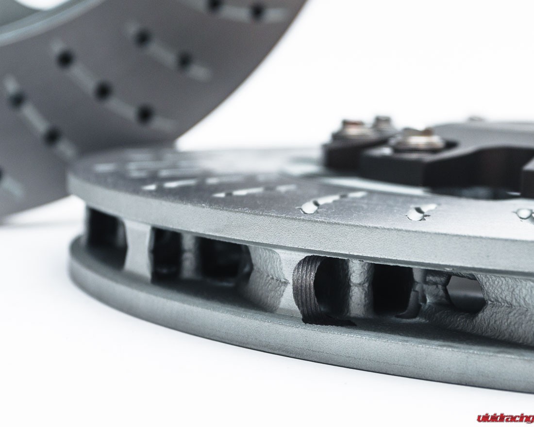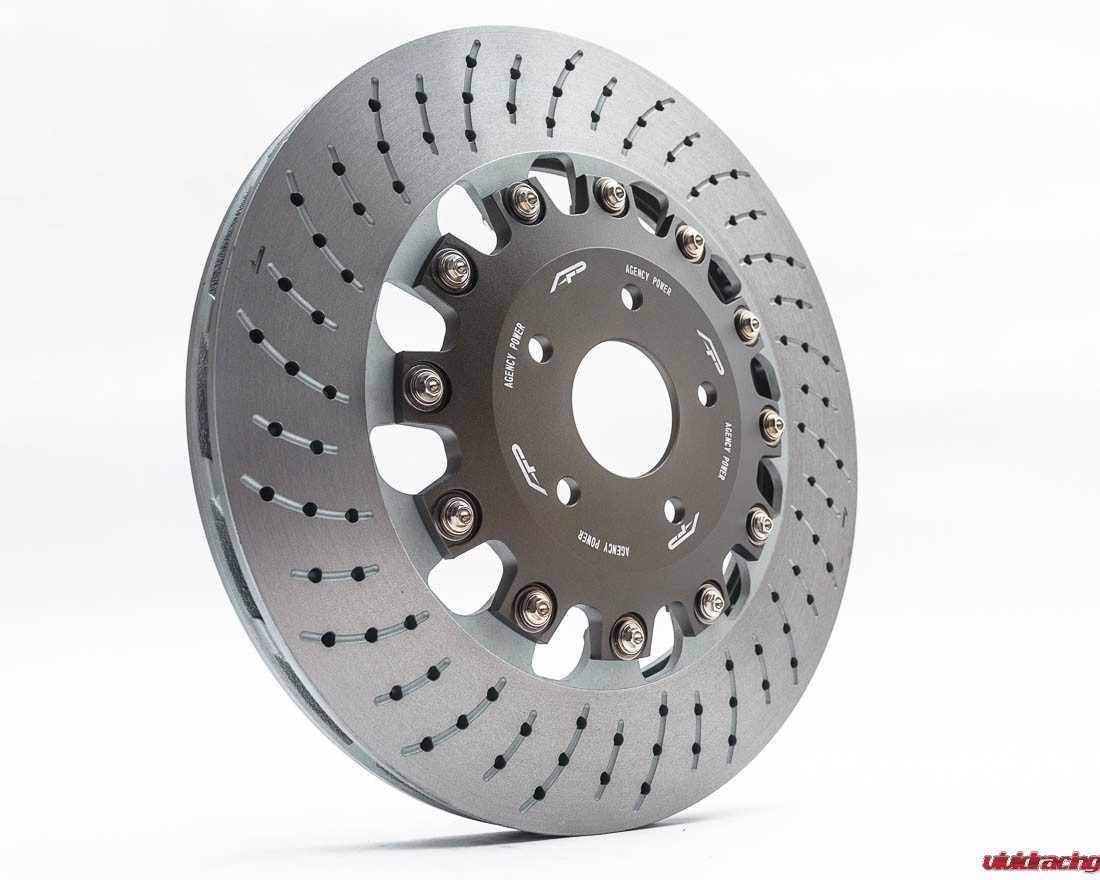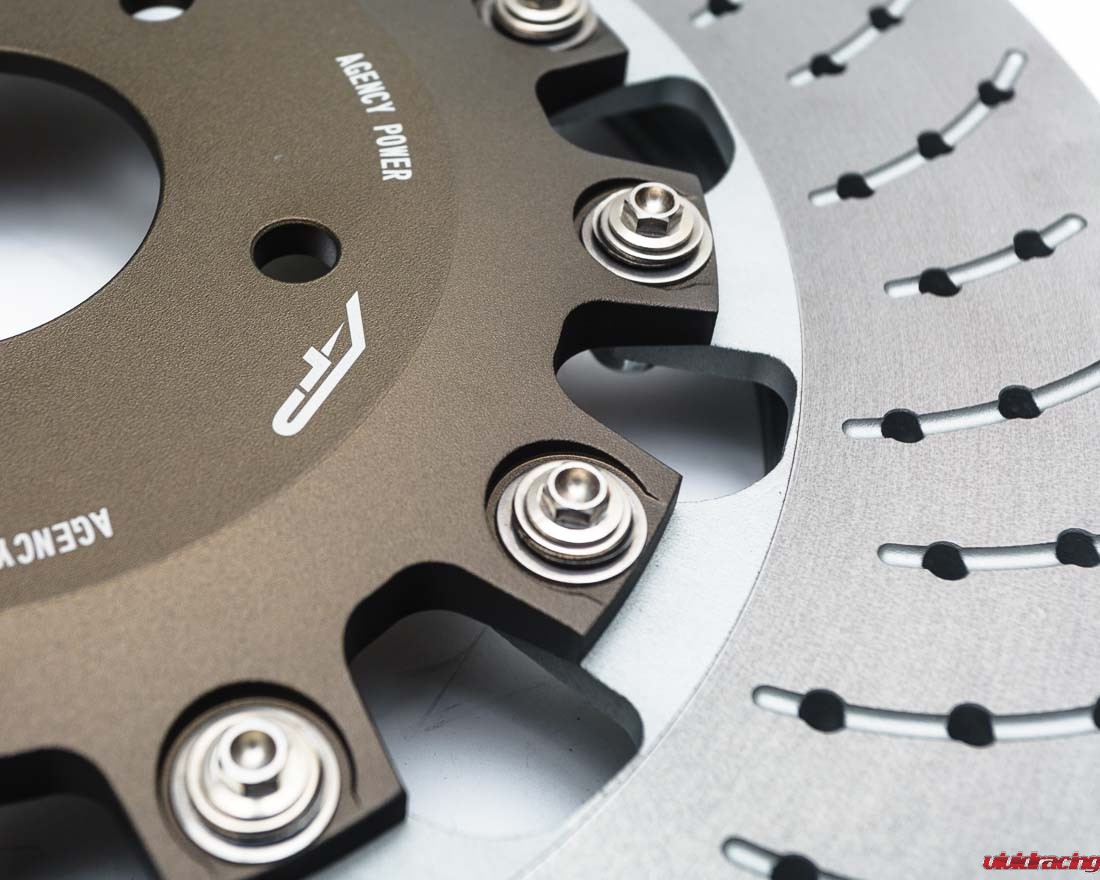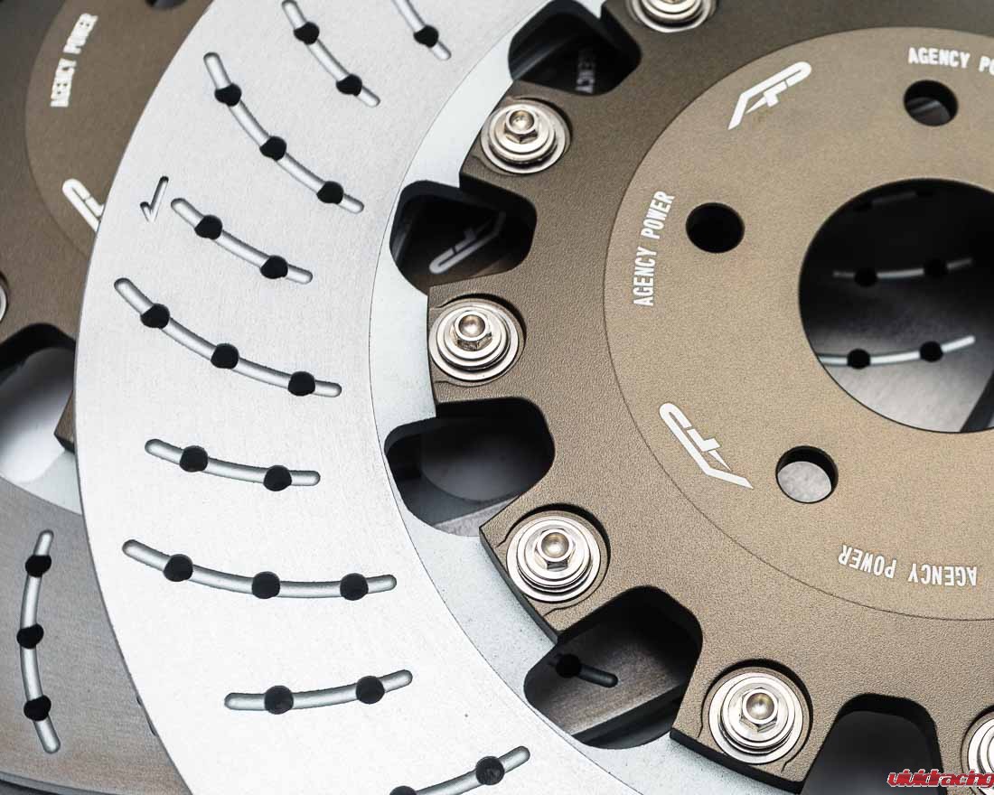 To improve your braking, you want to have better heat dissipation, even brake pad wear, and a firmer pedal feel. These rotors feature a unique pattern with the drilled holes overlaying the slotted design. Also called the turbine pattern, this design was launched after an in-depth amount of lab and real world testing. When tested in the lab, this design allowed for air to be sucked into the surface and pushed out through the vanes like a turbo system. Regular drilled rotors get stressed from the heat and eventually crack like the factory ones do. Slotted rotors are great for the track and do not have cracking issues like drilled rotors. However they do not dissipate heat as well. The new design by Agency Power gives the maximum amount of heat dissipation along with improved longevity of the rotor. With the more effective curved vanes, it helps dissipate heat away from the rotors. This design is used to improve cooling by pushing cool air from the center of the wheel to where the rotor needs it most. It also acts like a heat exchanger to carry heat away from the rotor. With the 2 piece rotor design and the improved cooling, the brakes pads have an even wear on both sides and eliminate potential brake fade.