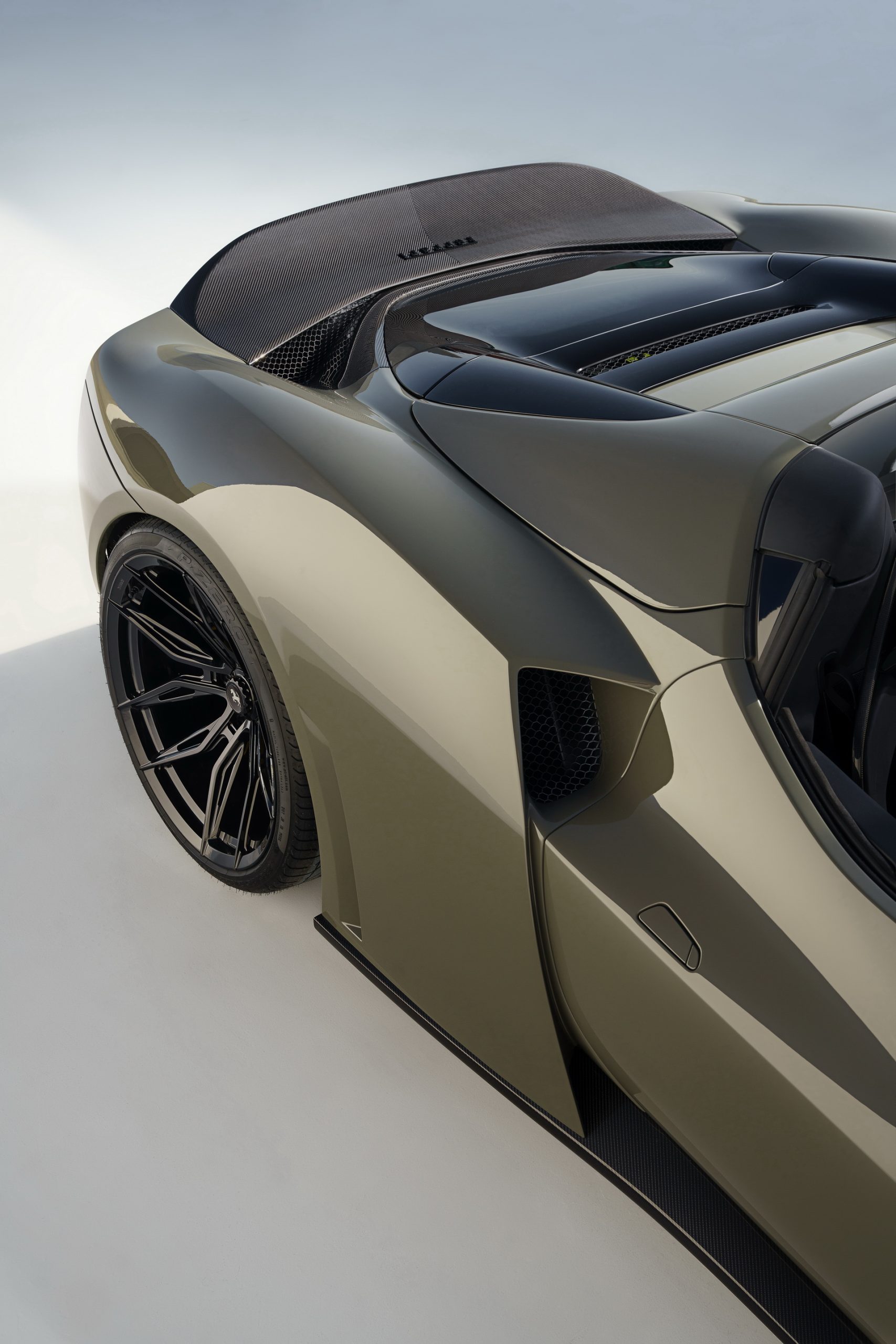 The packaged wheels are manufactured in the USA for the German tuner by Vossen. The wheels are a 21/22 inch combination to fit the new aesthetic of the supercar. Beyond the aero is a full performance upgrade that takes the output of the twin turbo v6 to 868 horsepower which is 200 horsepower more than stock. This includes new turbo inlets, 100 cell catalysts, Novitec Sports exhaust in stainless steel or Inconel.