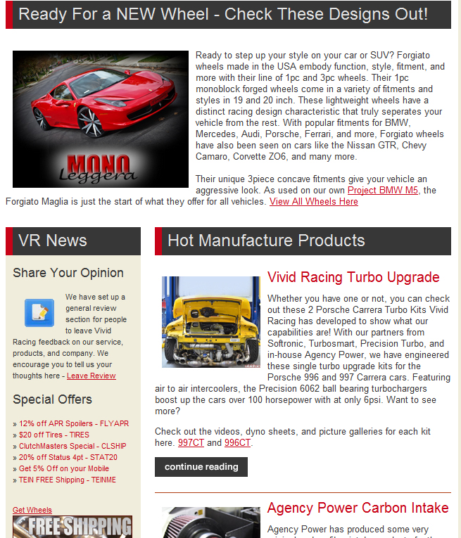 If your not on our mailing list, well then your not cool! So go and add yourself here. In the meantime we have put it up online for your social networking people to catch a glimpse of while you work, jog, or relax on the couch. In this newsletter you will find some cool COUPON offers, new wheels from Forgiato, updates on the Agency Power carbon fiber products, and more.