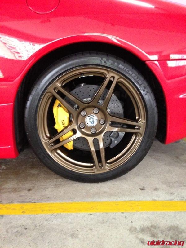 First up is this Ferrari F430 with a set of HRE P47SC wheels in bronze. These wheels look stunning as a contrast to the Ferrari red paint. The SC series is more concave then the standard Monoblok wheels HRE designs. This is what they refer to as Conical. The wheels are a 19×9 +28mm offset in the front and a 19×11 +33mm offset in the rear. The wheels have been wrapped with a set of Michelin Pilot Super Sport tires that are a 245/35/19 and 295/30/19.