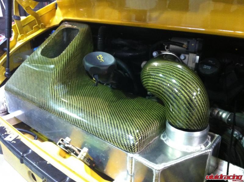 This turbo upgrade is coming along nicely! We now have all 3 carbon/kevlar pieces done and the yellow is an excellent combo. We decided to leave this intercooler raw which shows off the beautiful welds.