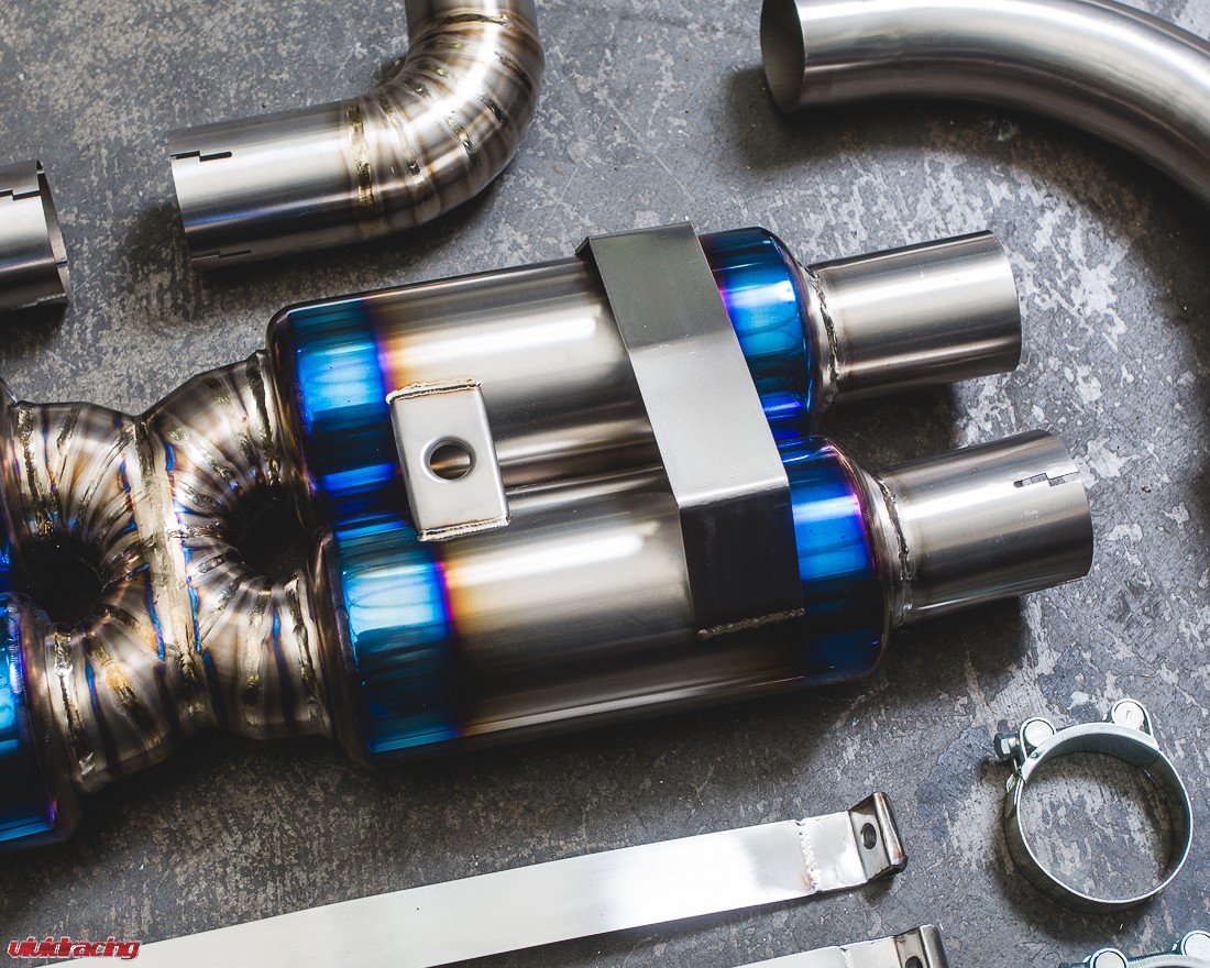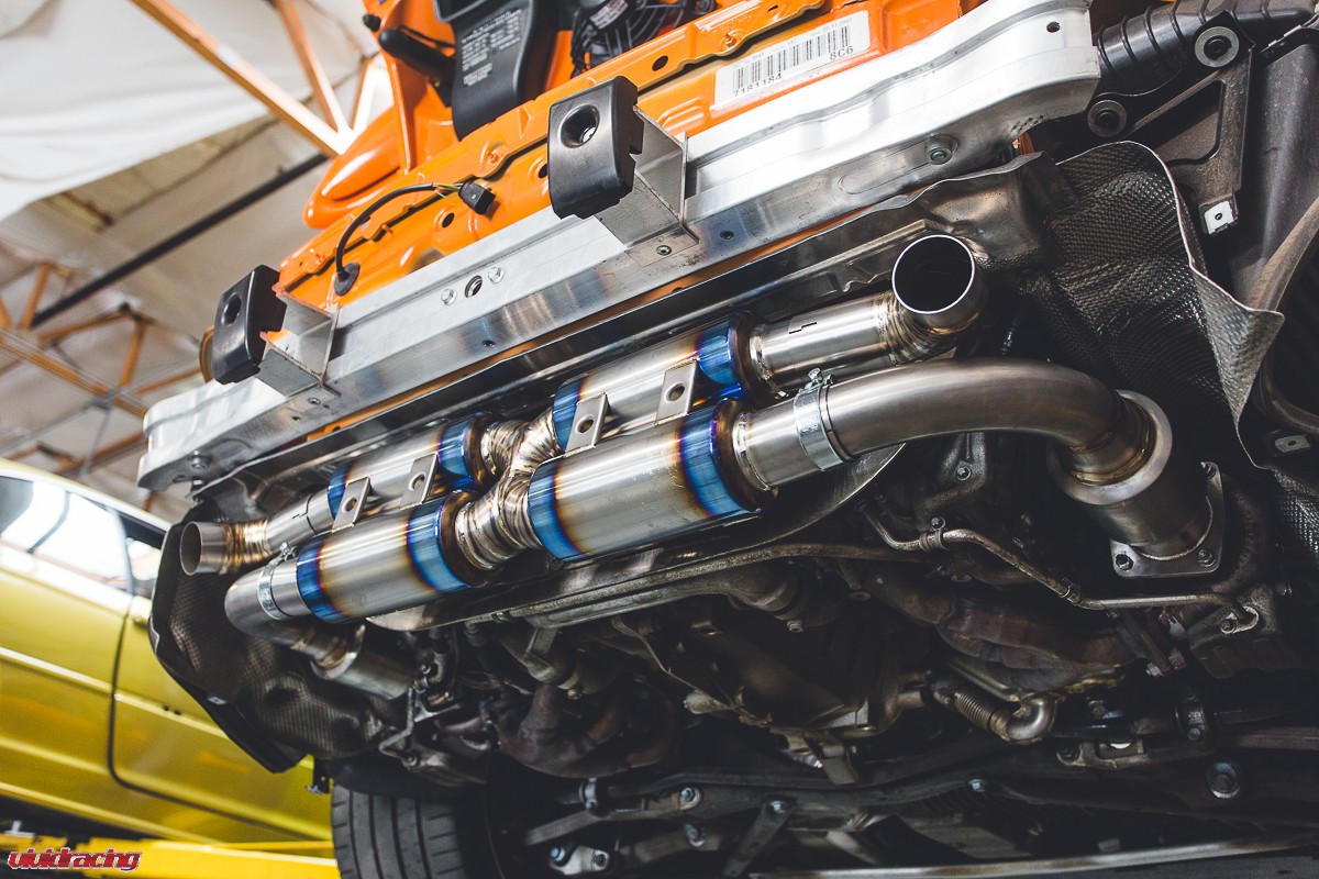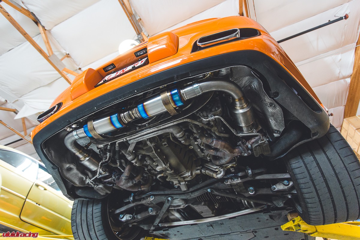 Earlier in the week we had a client come in looking for the next few things that would take his Beautiful Porsche 2008 997tt to the next level. After a short discussion minds were made up and the Agency Power Titanium exhaust was decided on in conjunction with a VRTune ECU Flash. The VRTuned ECU Flash via the OBDII port cranks some serious power out of the 3.6L bringing it up to an astonishing 460awhp! Once the car was tuned we moved onto installing the Agency Power Titanium Exhaust System. The Agency Power full Titanium Exhaust System is made of ultra lightweight titanium from the high flow 200cell cats all the way to the factory quad tip section. The increased the pipe diameter is 60mm inner throughout the system. Why Titanium you ask? The titanium construction gives the Porsche Turbo a unique sound that is slightly higher then typical stainless exhaust systems that many exotic car owners desire. Not only does the system produce an amazing exhaust note, but the Titanium construction weights in at a mere 21.25lbs (tips, hardware, and clamps included) saving almost 30lbs at the rear of the Porsche. Huge gains to the mid and top end of the RPM range of the turbo is noticeable immediately. The larger diameter piping allows for more air flow to the twin turbochargers resulting in much quicker throttle response and reduced turbo lag. You can choose to purchase our stainless or burnt finish tips separately or just go ahead and use the factory option.