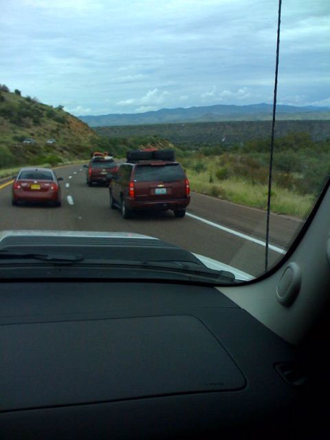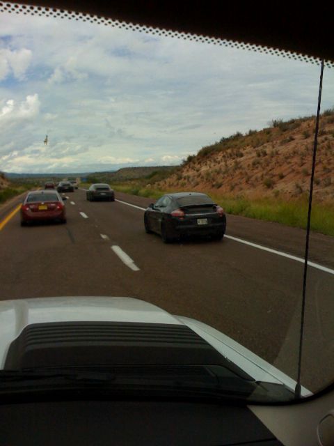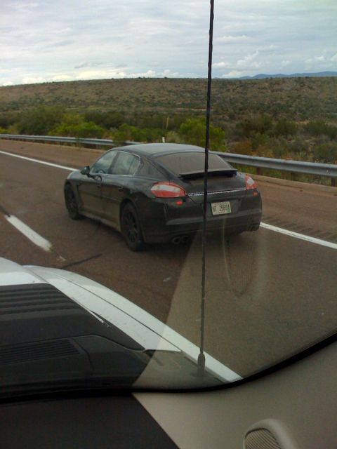 We are out to go ride the dirt bikes in AZ on the way to Payson. As we are cruising up the 87 we spot a train of 5 Porsche Panamera cars with 2 chase trucks loaded with equipment. They were all black sedans and 1 green one. The cars were mostly exposed with some headlight covers and door trim. Not a bad Sunday sighting! This is our first mobile blog from the iPhone. Stay tuned for more updates.