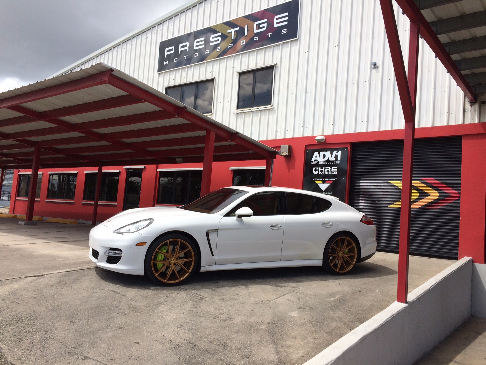 Our customer in Puerto Rico, Prestige Motorsport, is preparing this land yacht Porsche Panamera Turbo for this weekends half mile event. The white sedan features our OBDII VR Tuned ecu flash that is done with the DimSport handheld device. VR Tuned can now OBDII ECU Flash all Porsche Cayenne, Panamera, 981, and 991 vehicles. Of course all older 997, 996, 986, 987, too. In addition to the VR Tuned ECU Flash to give the car 100 more horsepower, they have also added the Agency Power titanium catback exhaust system.