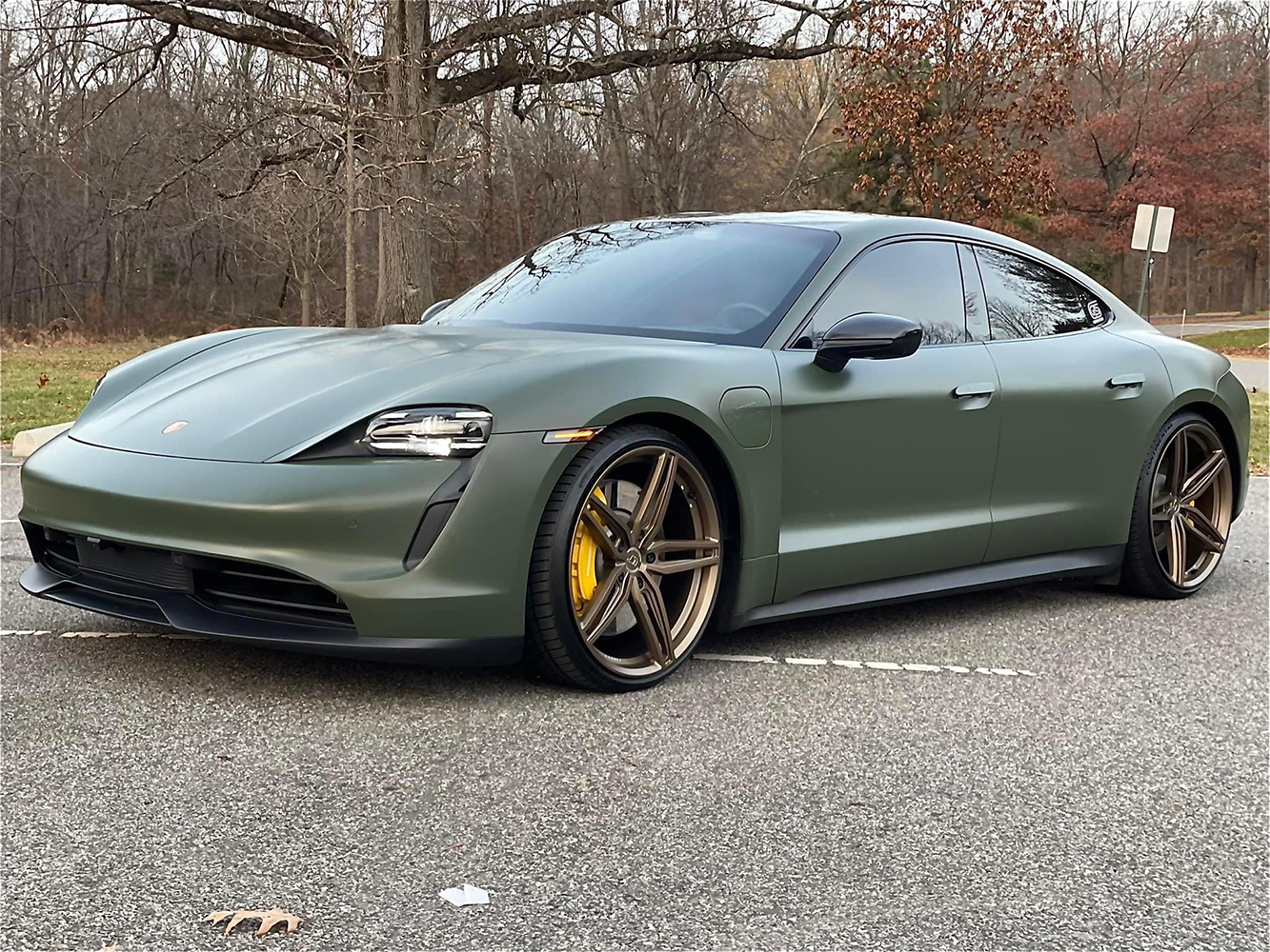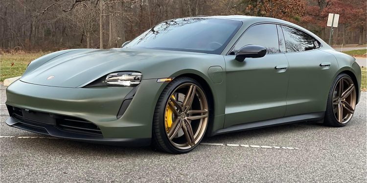 The Porsche Taycan 4S featured in this post has a stunning matte green exterior which pairs beautifully with 22-inch VR Forged’s D10 wheels in satin bronze. What’s more, the bronze wheels really compliment the big yellow calipers behind them. These wheels come in 22×10 at the front and 22×11.5 at the rear with a +56 and +59 offset respectively. Each individual wheel weighs in at about 14 kilograms (30 pounds) and has a load rating of up to 720 kilograms (1587 pounds). Recommended tire fitment is 265/30/22 for the front and 305/25/22 for the rear.