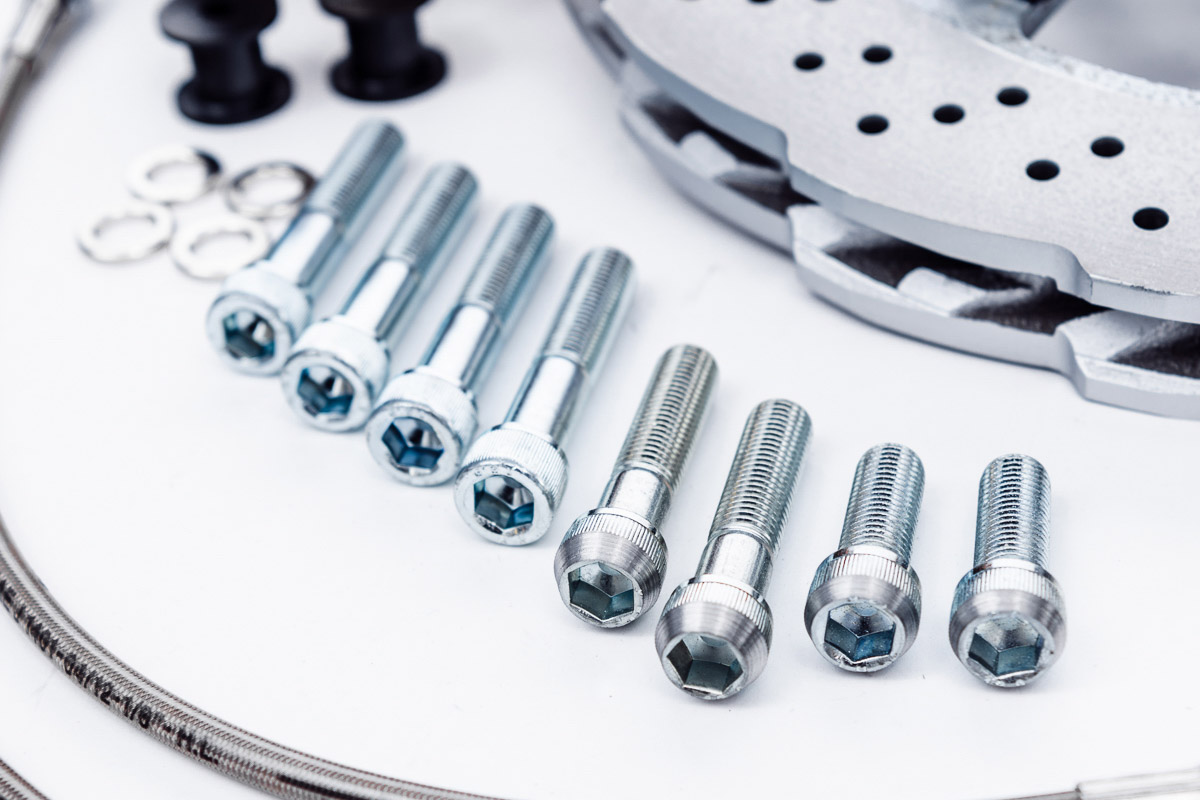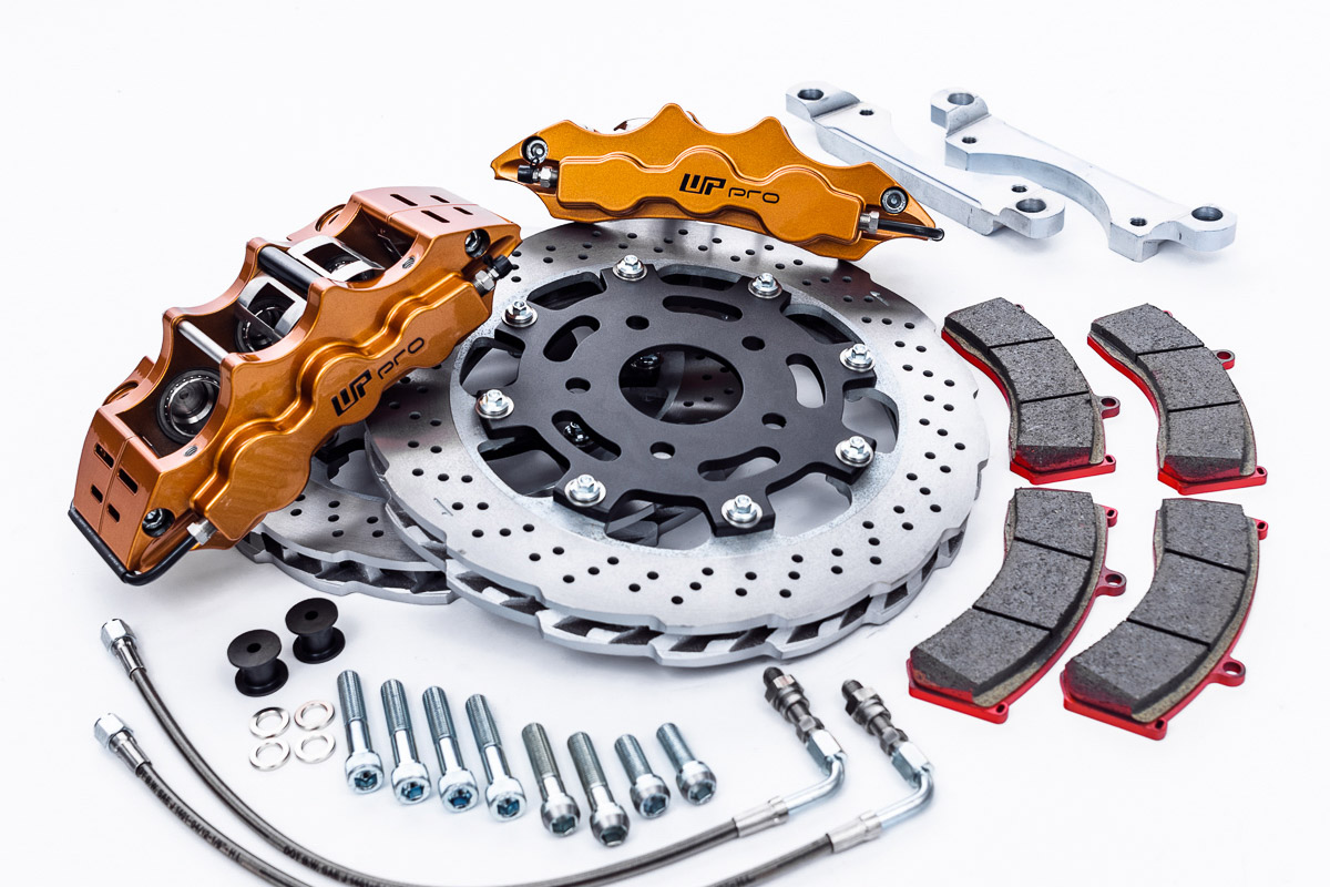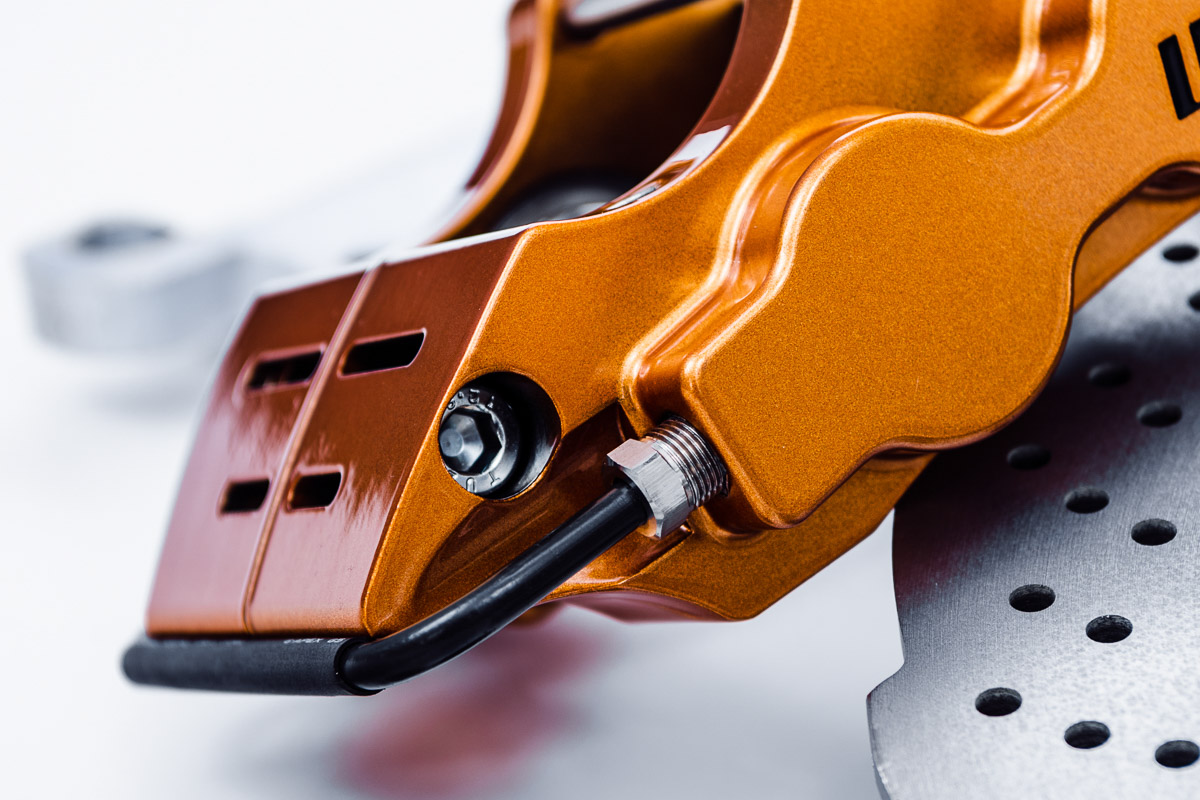 Of course, pads and rotors aren’t everything. Also included in the kit are steel braided brake lines, all the necessary hardware, and the mounting brackets. The standard rotors included with the kit are sun cut, drilled, and slotted rotors, but round, drilled and slotted rotors are also available. If you want to run 17” wheels and still want superb braking performance, the WP Pro drag kit is perfect for you.