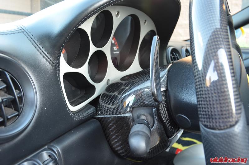 Inside the cockpit, everything has been freshened up. All the silver trim has been restored to a bright showroom finish. The DCT custom, flat-bottom steering wheel now fits in with the new carbon fiber accented steering column and paddle shifters. Even the door levers have been overlaid with carbon fiber. With its complete header back valvetronic exhaust from Agency Power, Fabspeed carbon air intakes, and VRTuned ECU tune, this car sounds and goes the part! Keep following our Ferrari 360 Blog for more updates and view the entire Project Car Gallery here.