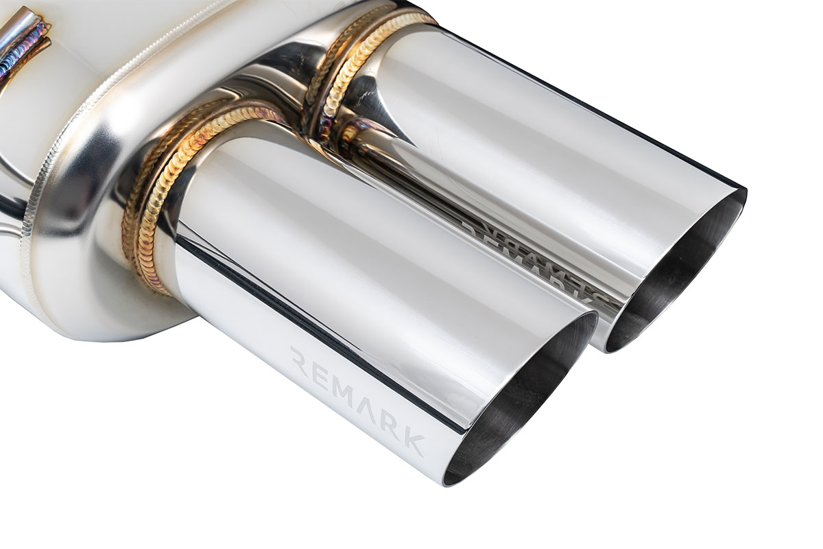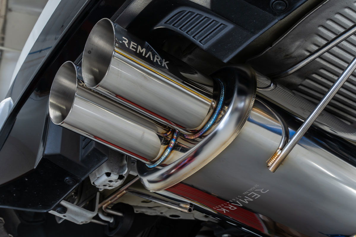 Remark exhaust systems are designed to provide a sporty exhaust note which is louder than stock, but still quiet enough to keep your neighbors happy. This new exhaust system uses all the OEM hanger positions and features dual 3.5” slant cut tips, which fill up the exhaust cutout.