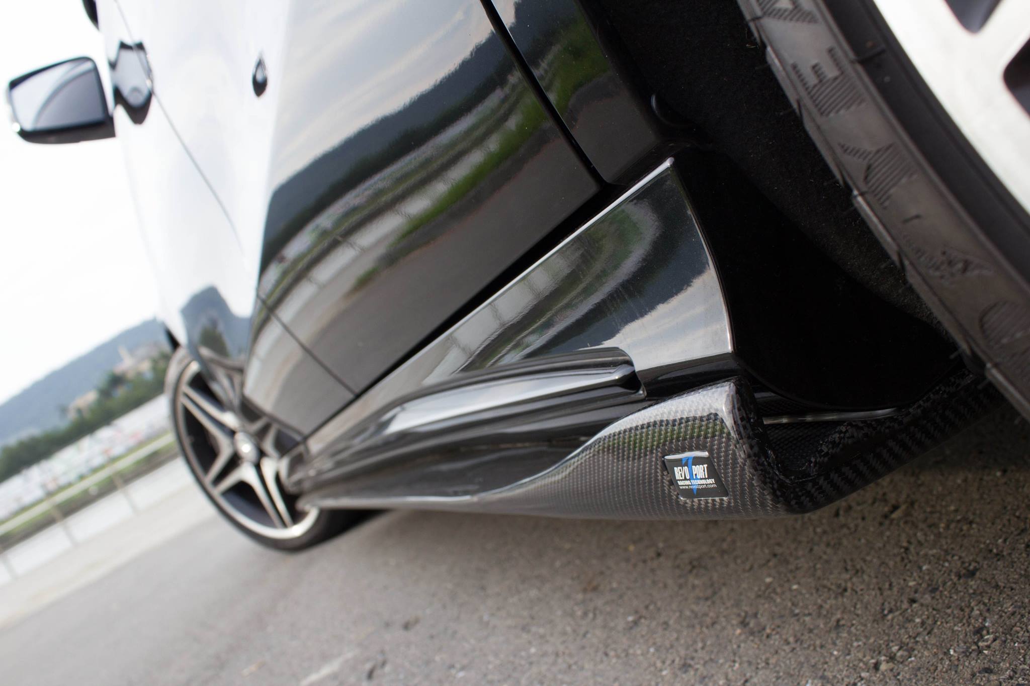 The original front splitter on the AMG side skirt is a non removable part. RevoZport designed a carbon insert trim to bring out the exotic look for this exhilarating sports car.