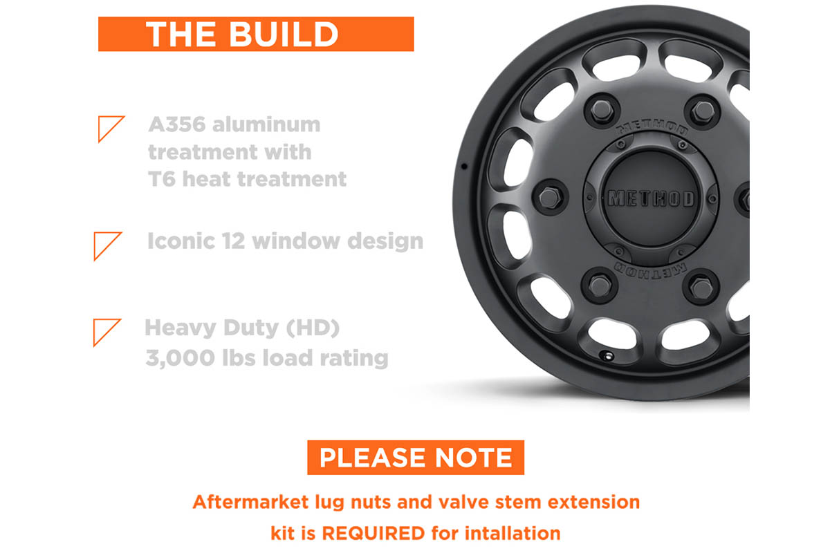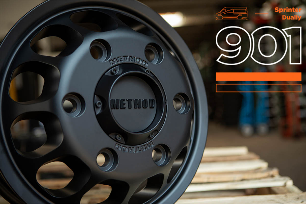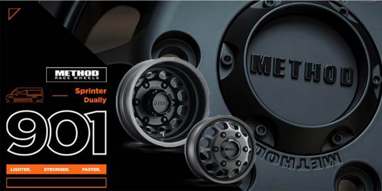 Method Race Wheels has released the MR901 wheels to accompany the dually Sprinter to give the ultimate style and durability. The MR901 features a classic 12-window spoke design using solid A356 aluminum. Utilizing a T6 heat treatment in the construction process, the MR901 provides immense strength with a whopping 3000-pound load capacity per wheel.