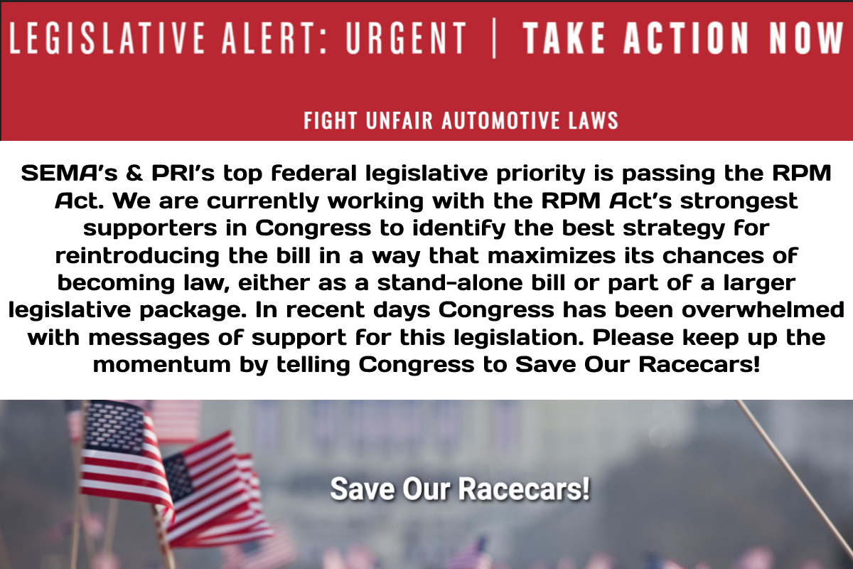 Republican and Democrat members of Congress have expressed a desire to provide certainty to racers and the motorsports parts industry. Even so, there is much more to be done before the RPM Act can become a law. Apart from signing the petition below, you can also utilize the assets found in SEMA’s digital toolkit: www.sema.org/rpmtools. Also, don’t forget to join the conversation online using the hashtag #SaveOurRacecars.