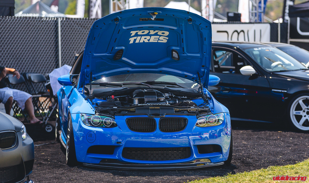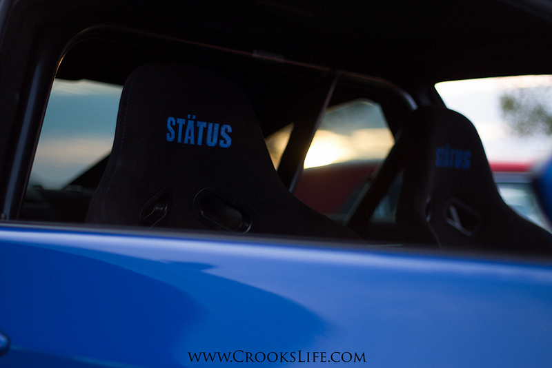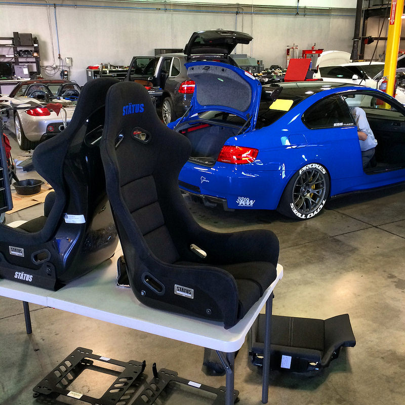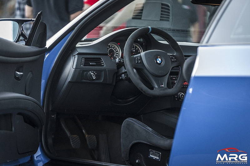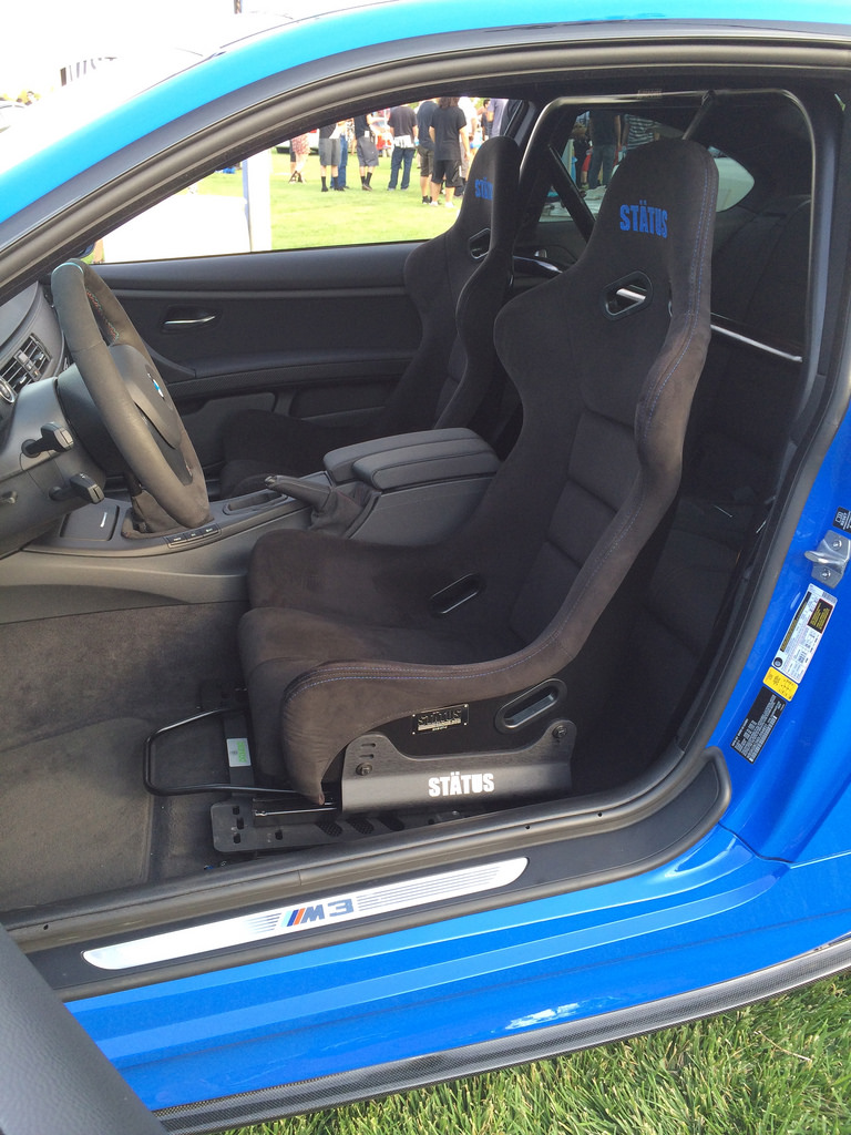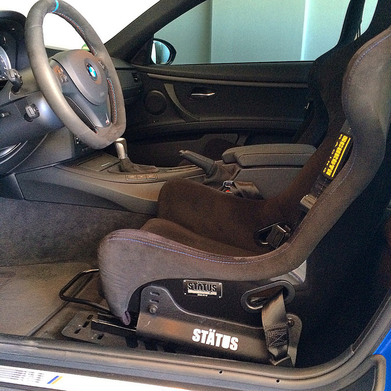 Santorini blue BMW E92 M3 built by C2K Motorsports featuring Status Racing FIA Approved GT-X seats with FRP backing, wrapped in ultra suede and blue stitching & logo to match the Santorini Blue.