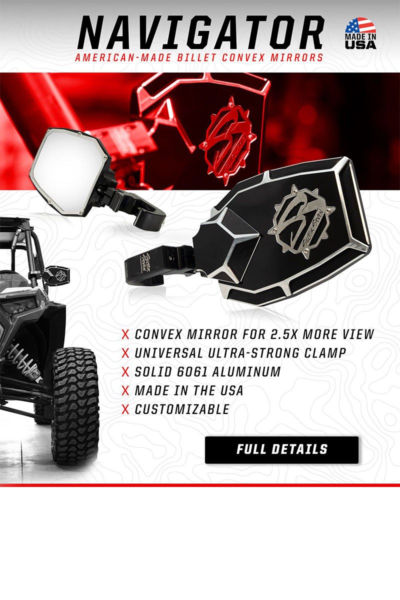 Sector Seven developed a pair of billet 6061 aluminum convex mirrors that give additional styling while providing 2.5x more line of vision. The ultra-strong universal clamp allows owners to install the Sector Seven Navigator mirrors in just 60-seconds. Easy installation and high-quality construction are what make the Navigator mirrors a must-have for any UTV owner.