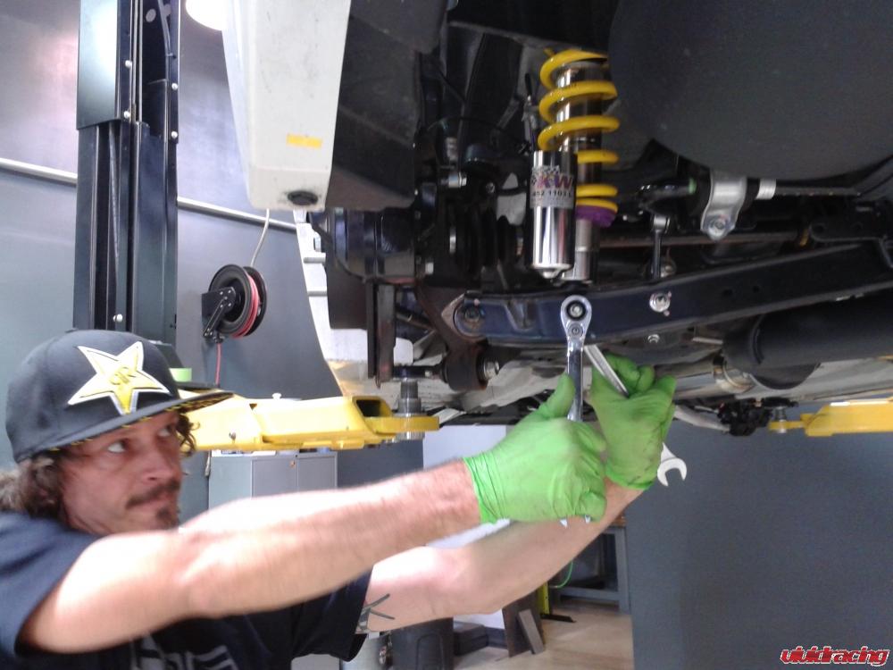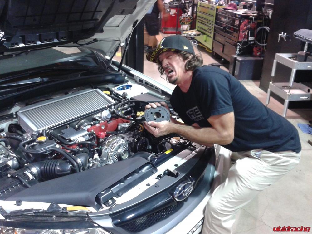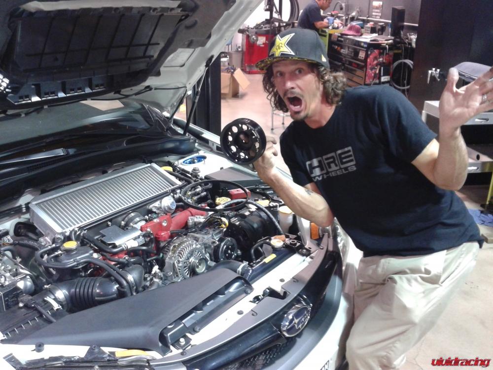 If you think all athletes are like what you see on MTV driving Ferrari’s and other rediculous cars, not Bucky.  In fact as a true enthusiast and now on Team Subaru, Bucky chose to move away from his 996 Turbo and get a 2012 Subaru STI sedan.  The 2.5L turbo sedan in white is a perfect street worthy machine for cruising the streets of San Diego.  But Bucky needed more.  What seperates Bucky apart from others is he gets his hands dirty and likes to show it off.  His first round of mods included installing a custom black ceramic coated Agency Power quad tips exhaust.  The catback exhaust is a full 3 inch in diameter which sits beautifully out the rear.  Because it is a catback, it does not require any tuning with the car.  Next he added the Agency Power lightweight crank pulley.  Saving close to 3lbs of rotational weight for a mere $100 is a definite notice in throttle response.  Next up were a set of KW Clubsport coilovers.  These coilovers are hand down the best fully adjustable coilovers for street and track as we even use on our own Project Cars.  The KW Clubsport feature adjustable height as well as independent rebound and compression settings which are a must for those personal Gymkhana days.  In addition, Bucky will be adding a set of Recaro Profi racing seats, some more Agency Power toys, and Seibon Carbon aero parts.