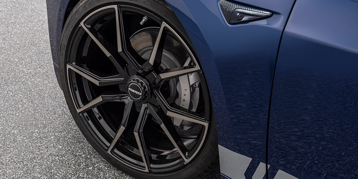 Size 9Jx20 wheels with 245/35 ZR 20 high-performance tires make full use of the available space in the front fender wells of the Tesla Model 3. Tires sized 285/30 ZR 20 try for maximum traction at the rear. STARTECH also offers complete winter wheels of the same size for the Model 3 sedan.