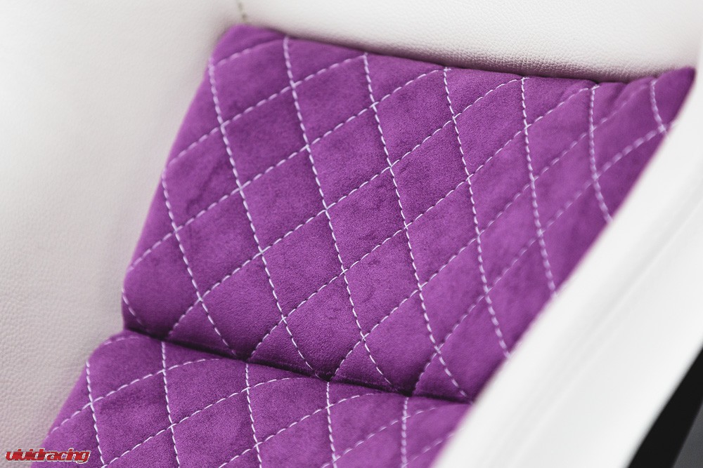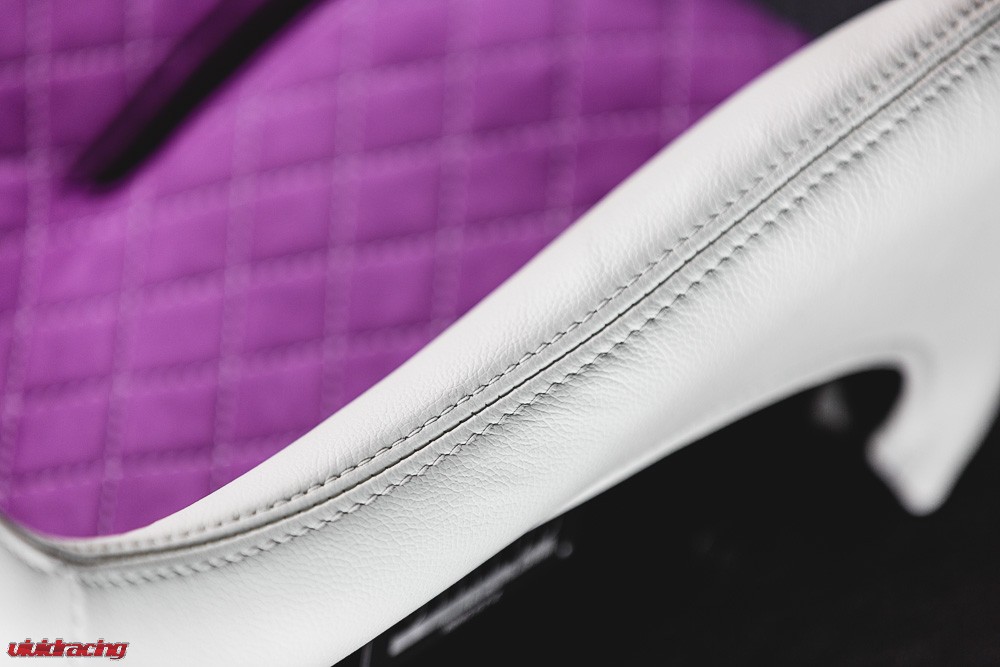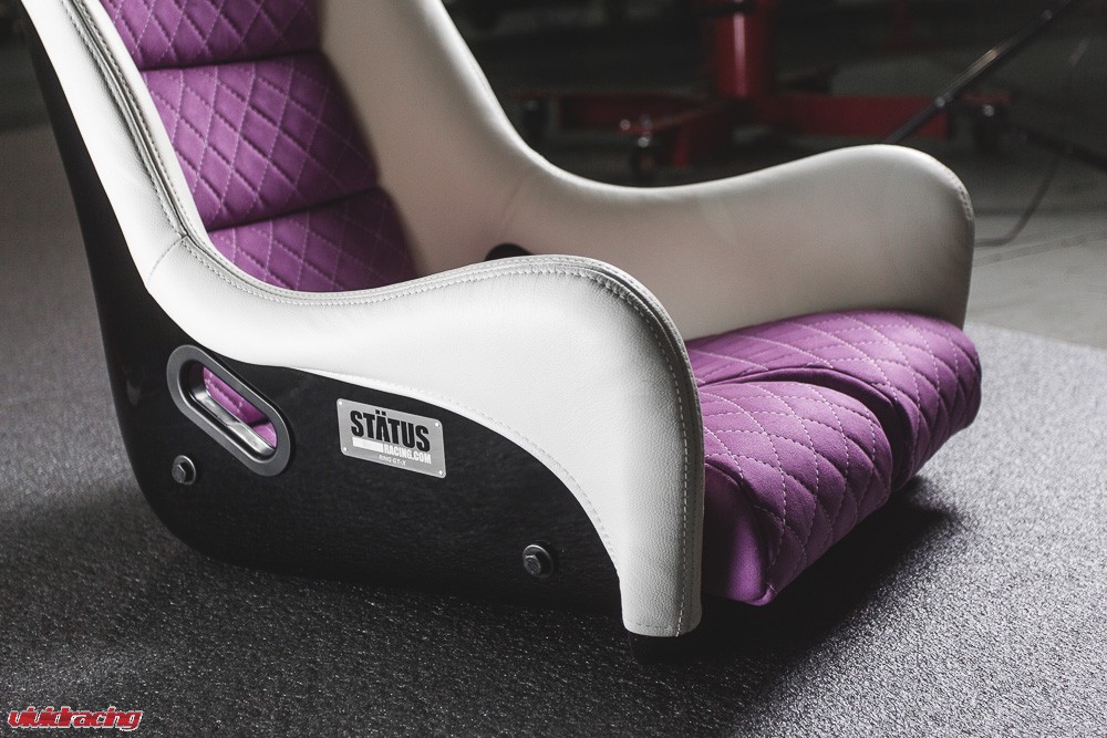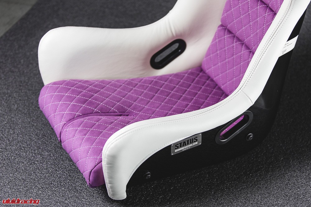 These one off custom Status Racing GT-X seats were put together for one of our clients. They feature FRP backing and are wrapped in white leather with diamond stitched lavender inserts.