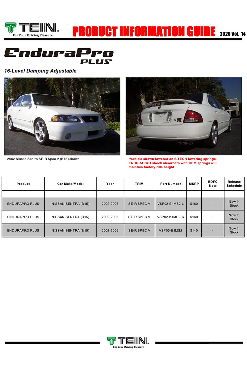 16-way damping adjustment is featured on the EnduraPro Plus for the 2002-2006 B15 Sentra. The adjustability allows owners to dial the suspension for specific conditions on the fly while maintaining smooth transitioning. The twin-tube design provides longer strokes with less force exerted through the chassis resulting in a firm yet comfortable ride.