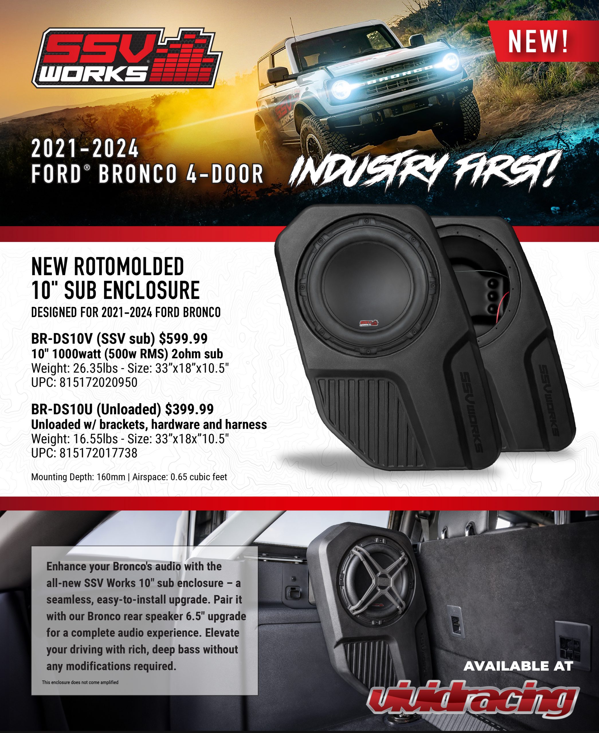 Enhanced Audio Experience Enhance your Bronco’s audio with the all-new SSV Works 10″ sub enclosure. When paired with our Bronco rear speaker 6.5″ upgrade, you get a complete audio experience that transforms your drive with rich, deep bass.