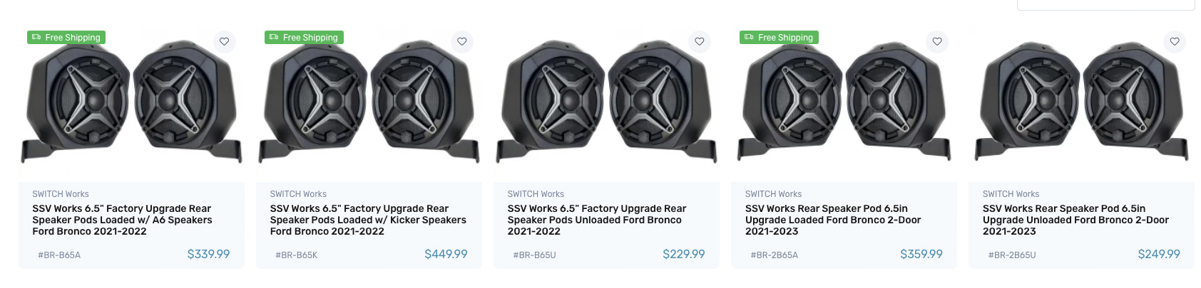 Vivid Racing also offers a full line of SSV Works speaker upgrades for the Ford Bronco. Many of these options come with free shipping, which is a plus!