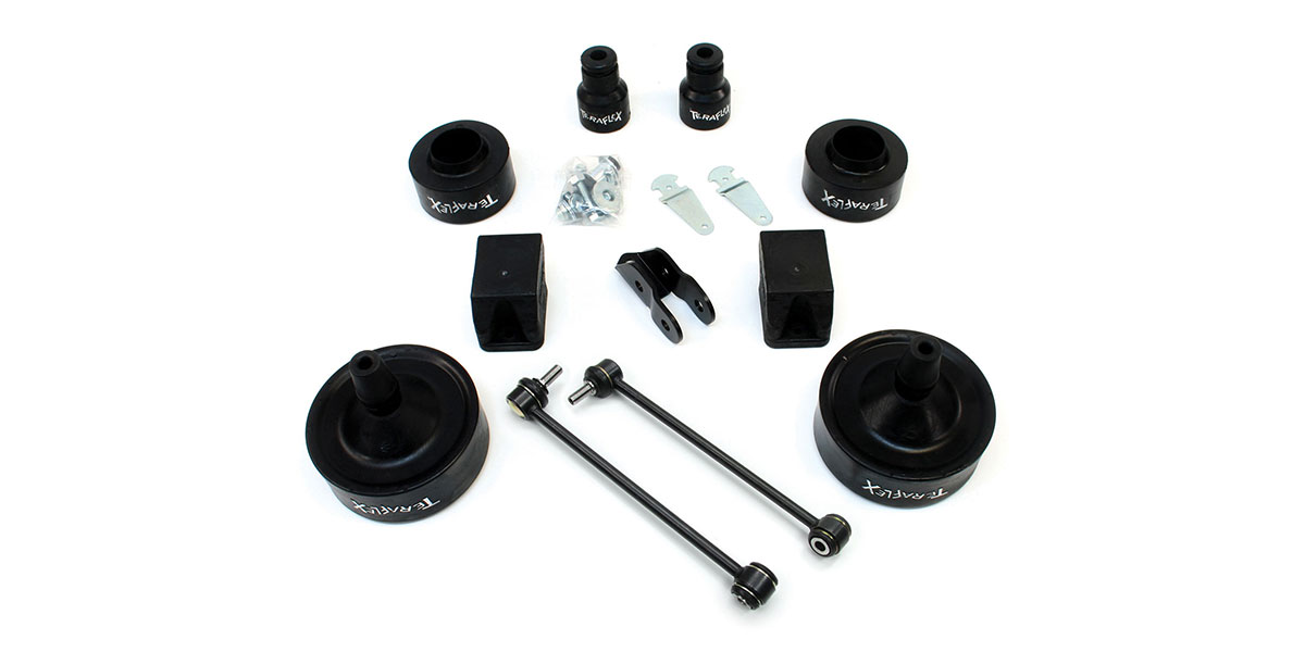First up on our list is the TeraFlex 2.5” spacer kit. TeraFlex has been making suspension lifts and suspension components for tons of different off-road trucks since 1996. This kit may seem a little expensive at a glance, but it includes absolutely everything you need for easy installation.