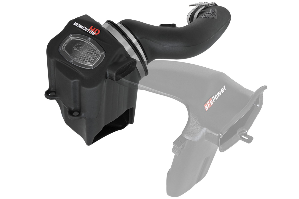The aFe Power Momentum HD air intake system spotlights a unique filter-to-housing interface that was built to include the largest air filter possible for unmatched results. The smooth one-piece high quality sealed housing with auxiliary air scoop eliminates the use of multiple pieces to ensure the coolest air intake charge available. It features a dyno-tuned intake tube designed to achieve the most power gains possible while maintaining an OE-style fit. A large, clear sight window is used for aggressive styling purposes as well as to provide a hassle-free filter inspection so you know when to service the air filter.