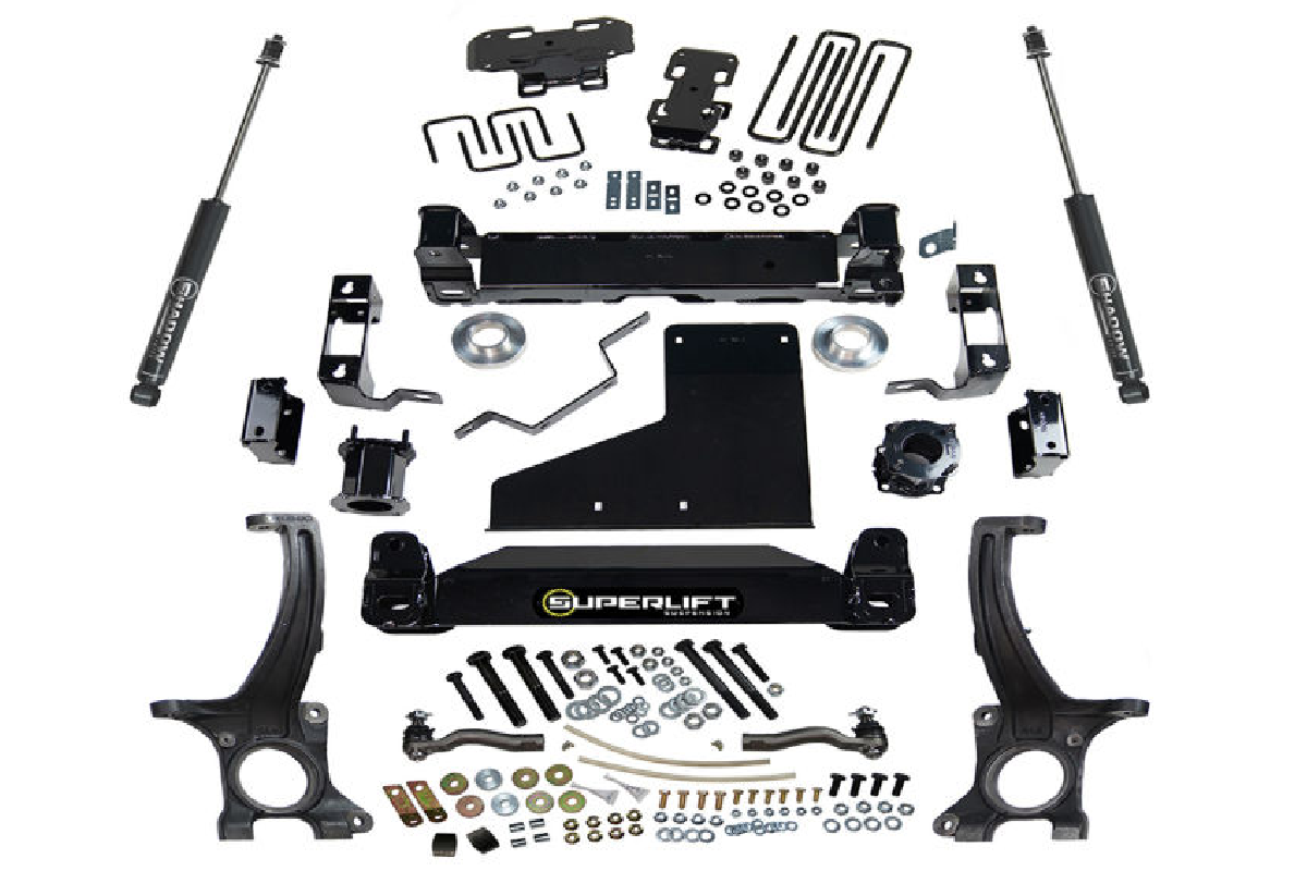 This kit lifts the front 6 inches and 4 inches in the rear and it includes steering knuckles, cross-members, differential spacers, strut spacers/preload spacer, rear Superlift or Fox® shocks, skid plate, and rear blocks.