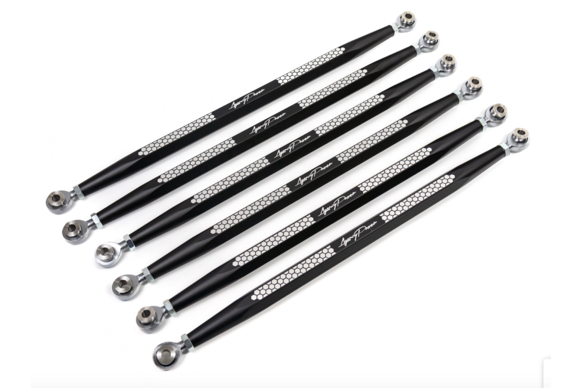Each rod end’s through-hole is 5/8 inches in diameter with steel spacers machined to Maverick X3 specs for a secure fit to the rear frame brace or wheel carrier. Each upper and lower radius rod features a hexagonal shape so you can easily adjust them on the fly using the proper tools. The Agency Power Adjustable Rear Radius Rods are powder coated in popular colors (silver, black, and red) and have a unique laser engraved pattern to go with your Can-Am Maverick X3 theme. The set of 6 rods is designed to work with the stock or aftermarket support brace to keep your UTV handling at its best.